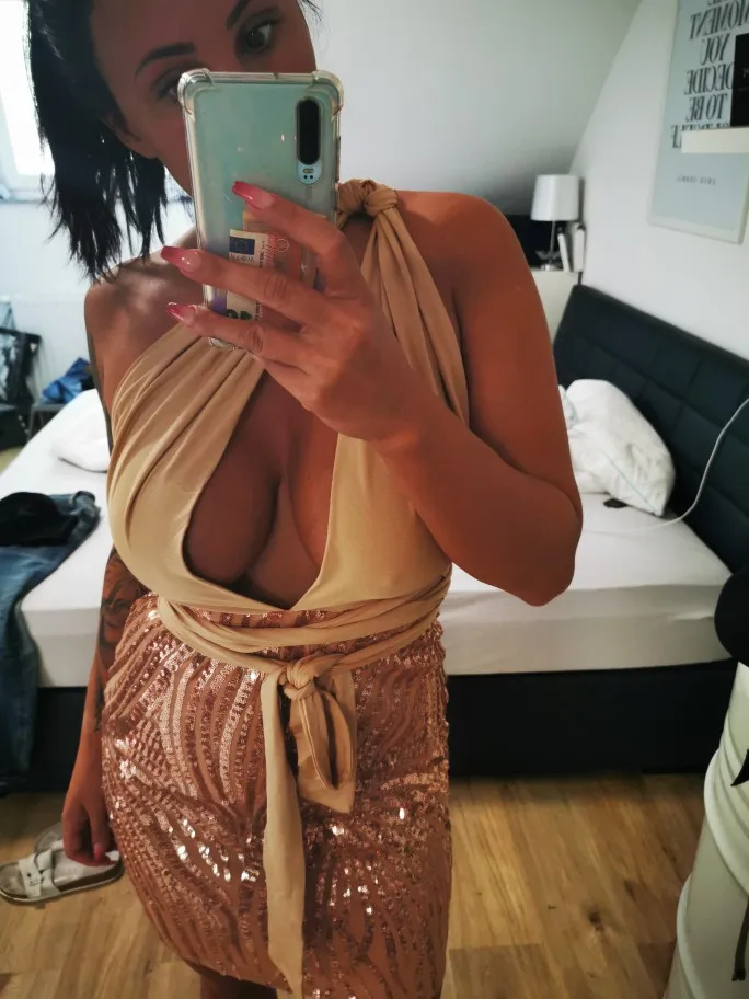 Plan on wearing the dress in September for my birthday so I’ll be back with pictures. Dress is beautiful, I don’t care for the top color but it appears prettier in pictures. I got a medium but could have got a small because of the amount of stretch in the dress, especially good area. (I’m 5’9 150lbs)