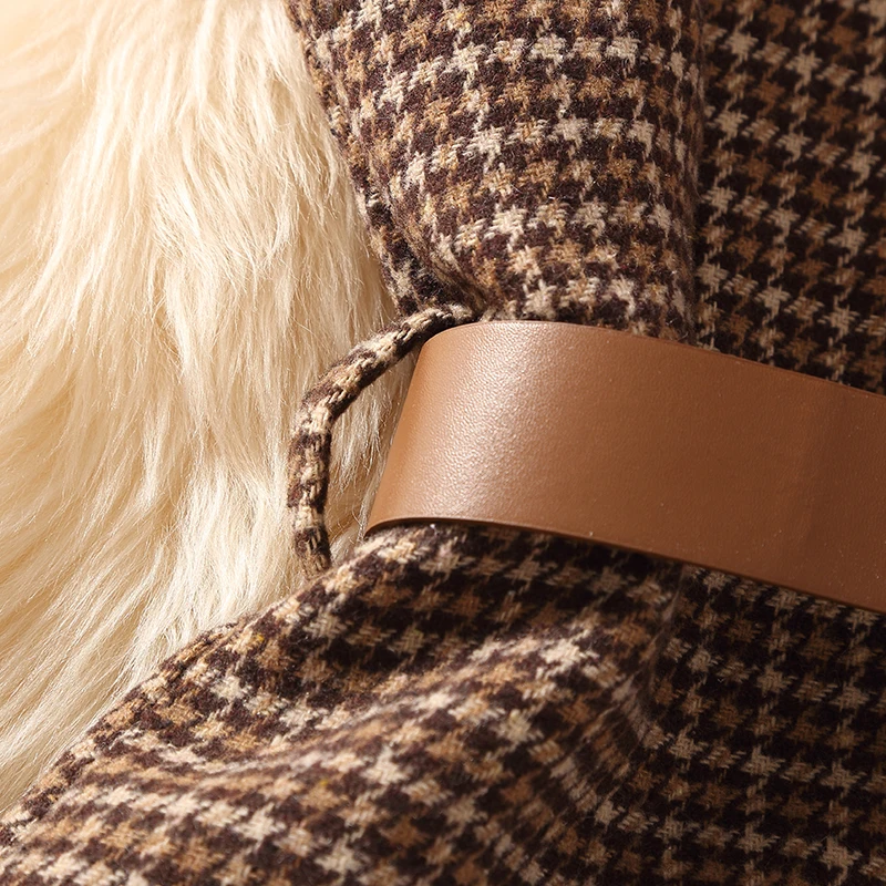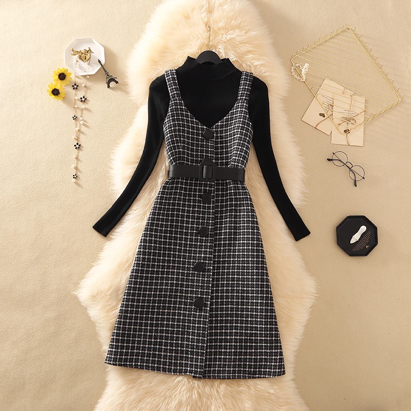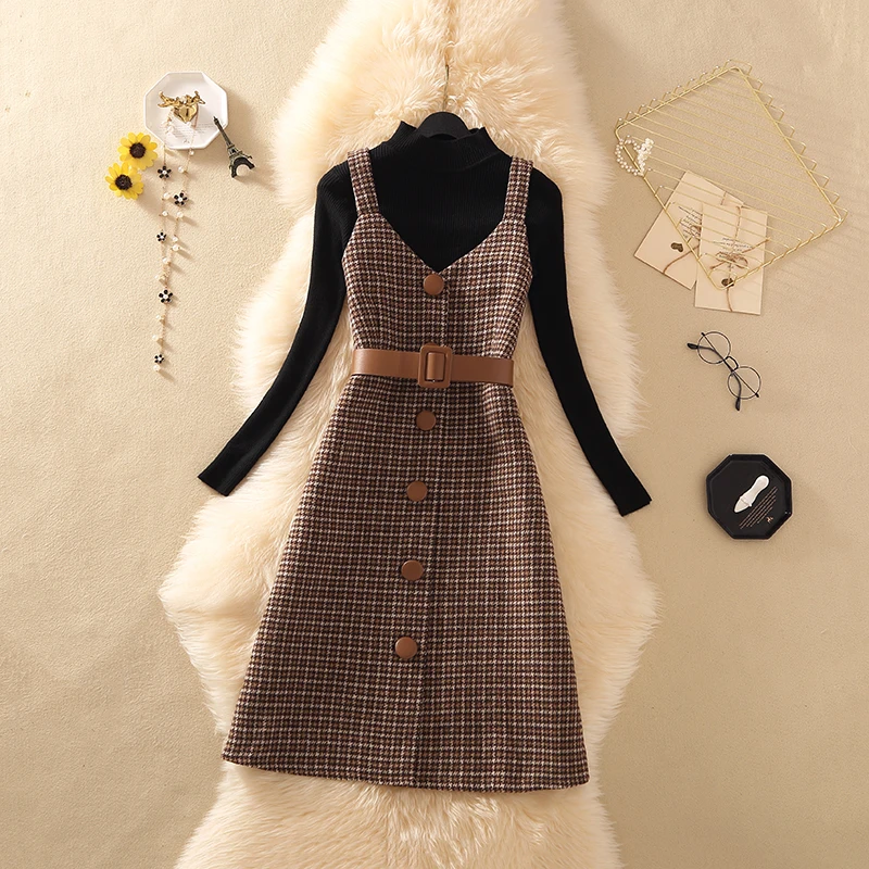 FREE SHIPPING Luxury Two Piece Plaid Tweed Dresses Suits With Belt JKP5883