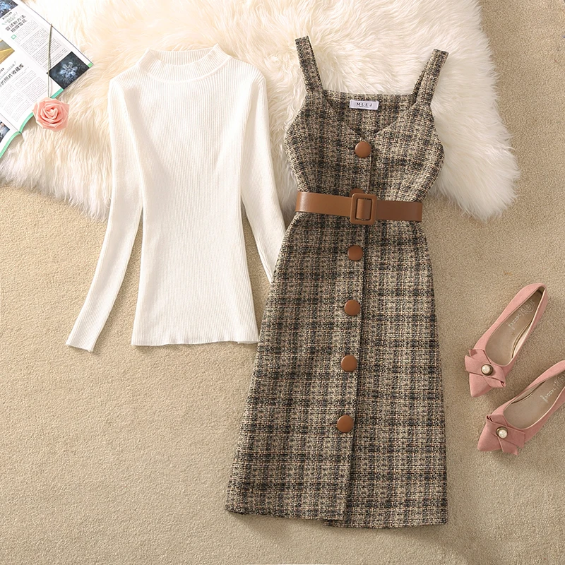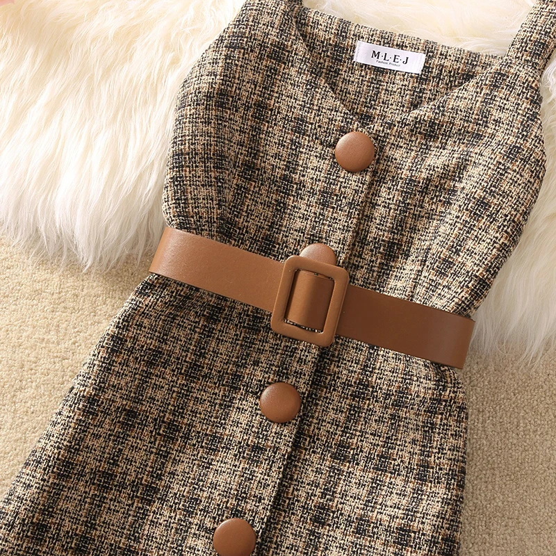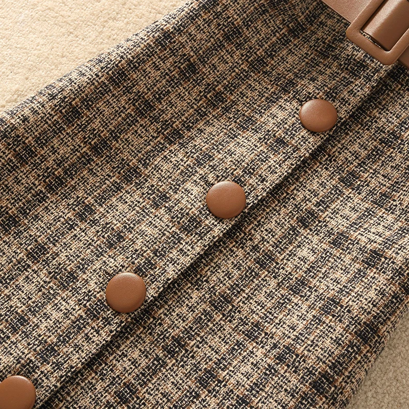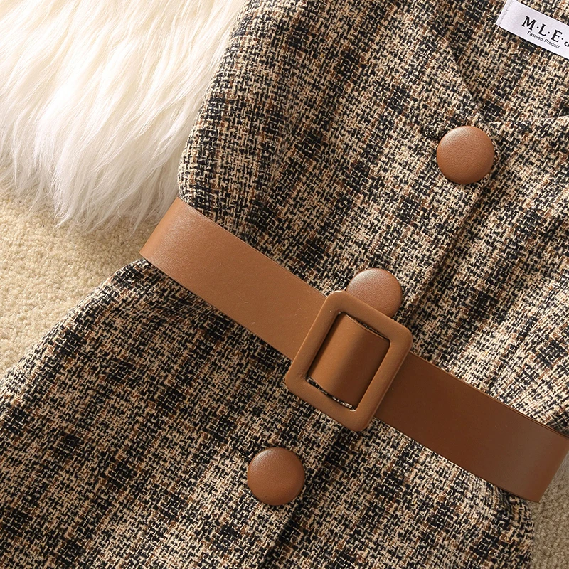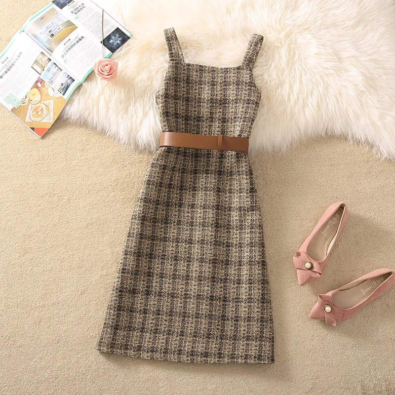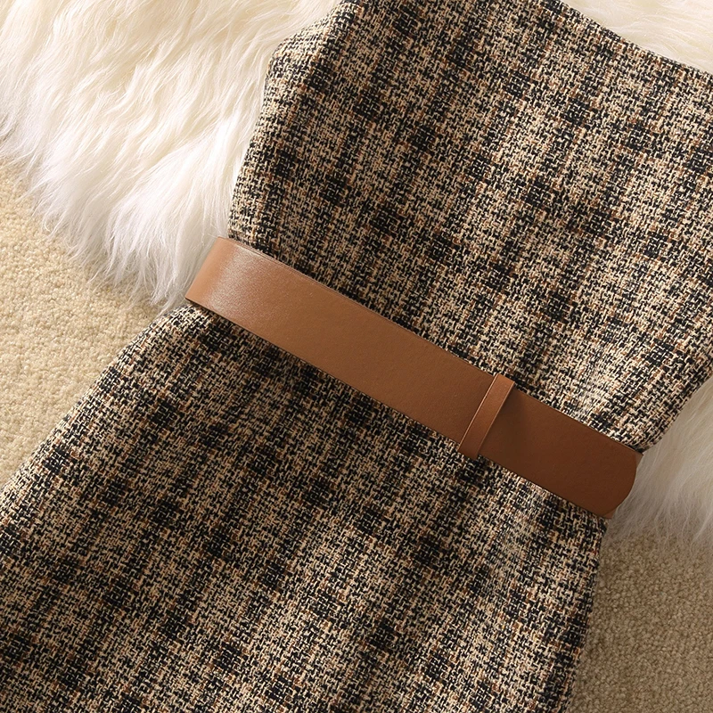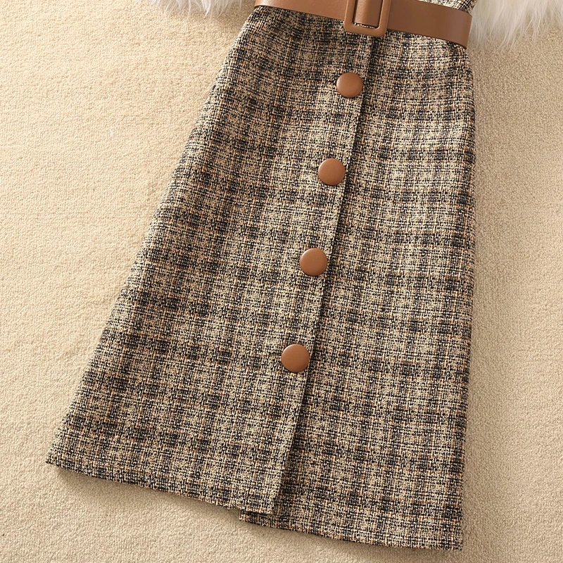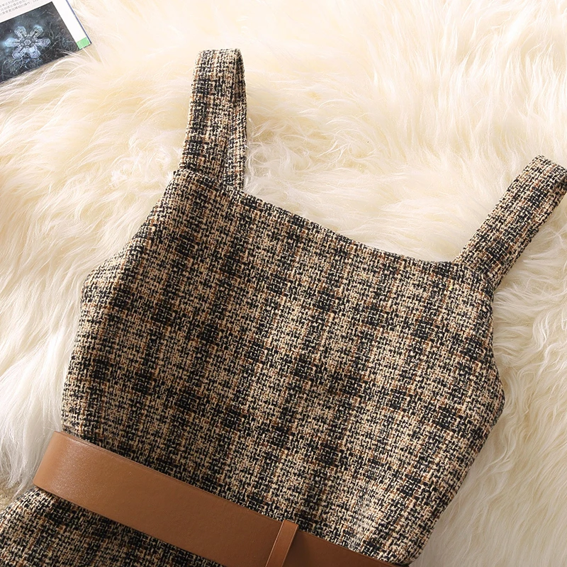FREE SHIPPING Luxury Two Piece Plaid Tweed Dresses Suits With Belt JKP5883