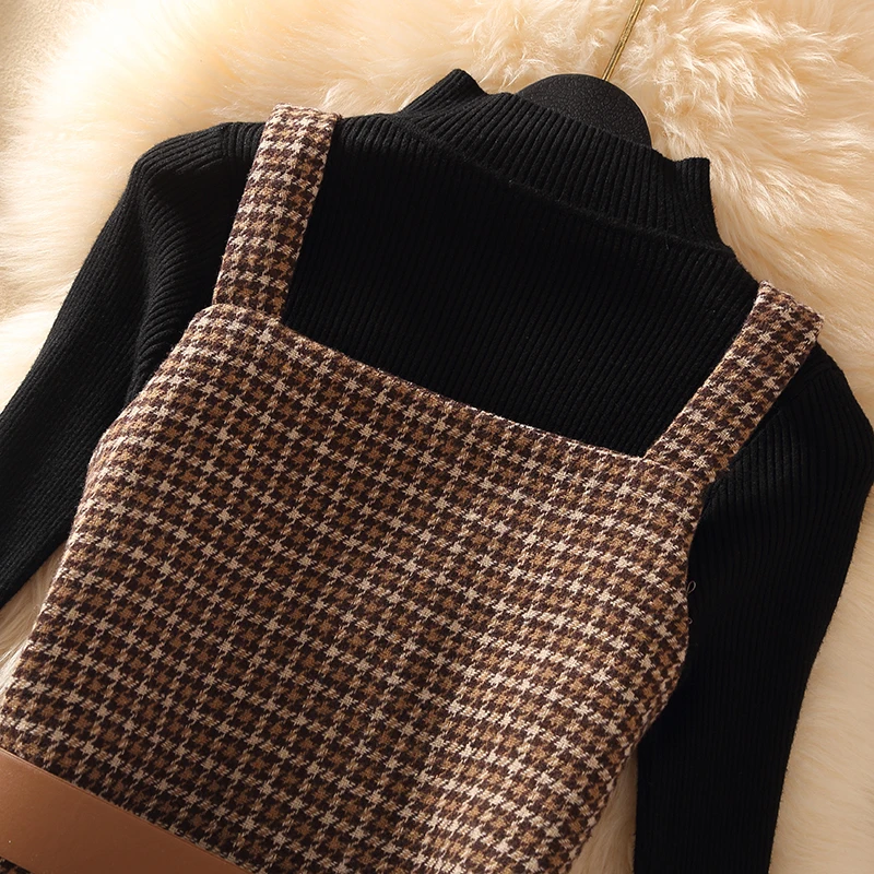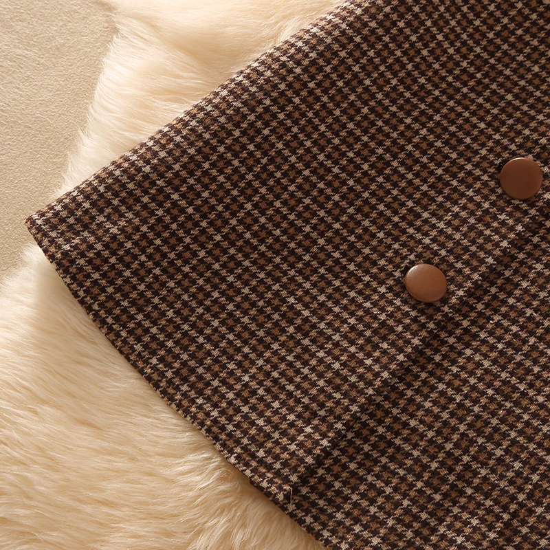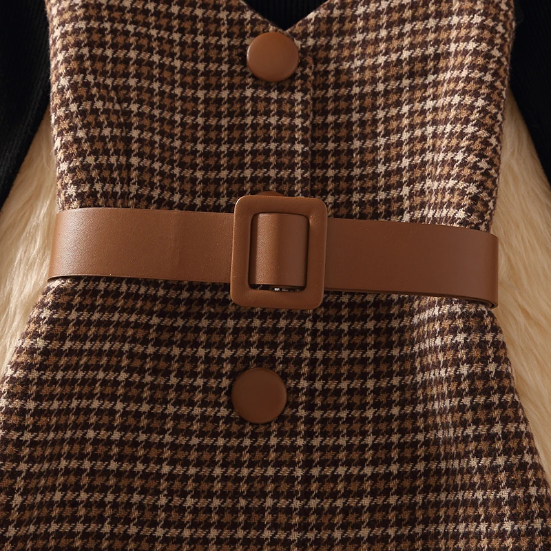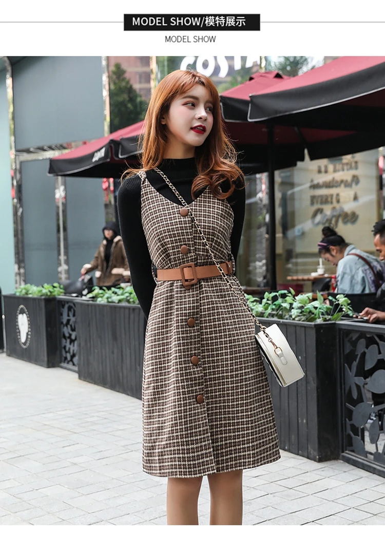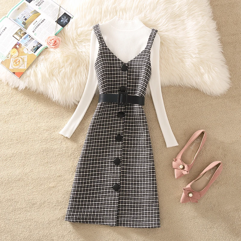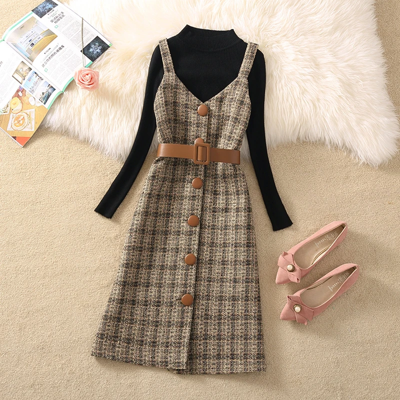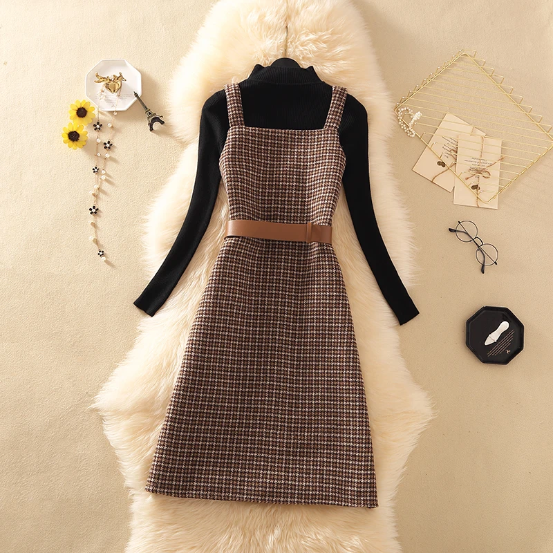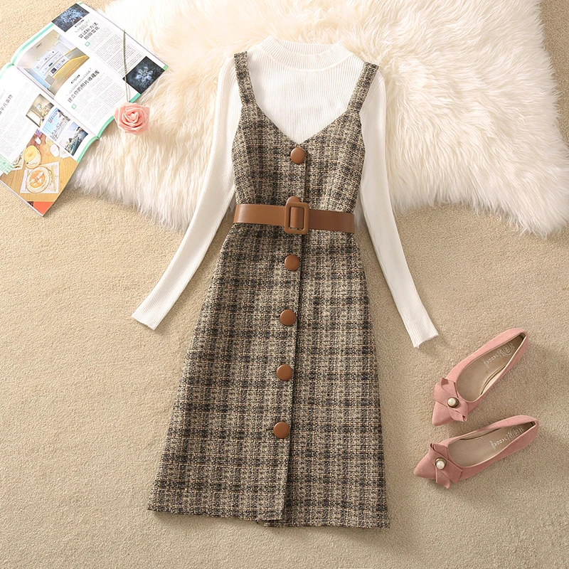 FREE SHIPPING Luxury Two Piece Plaid Tweed Dresses Suits With Belt JKP5883
