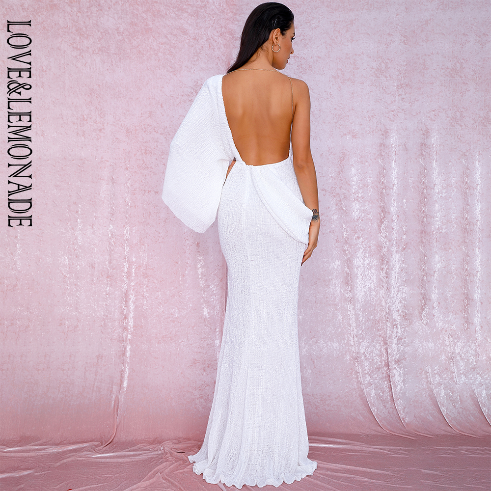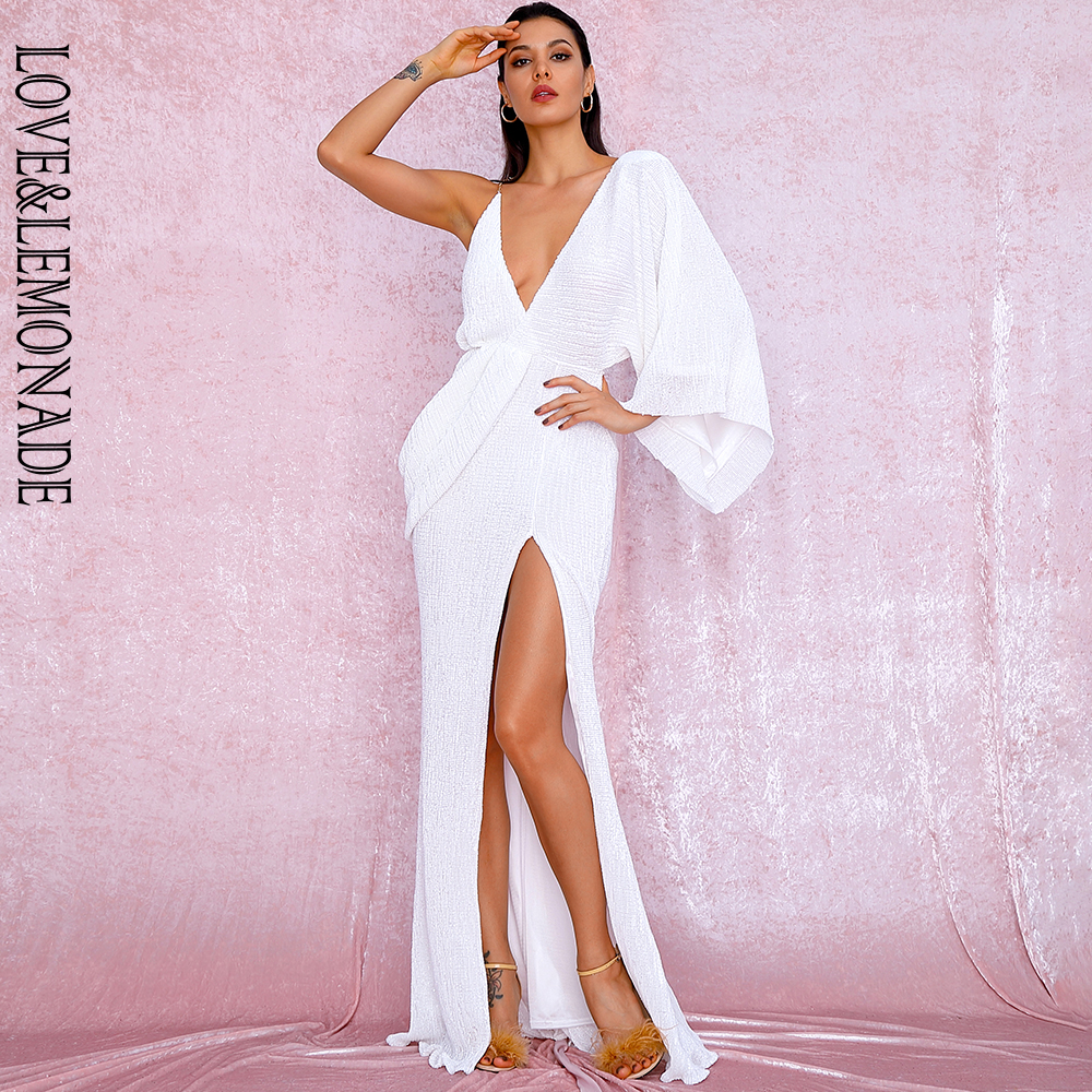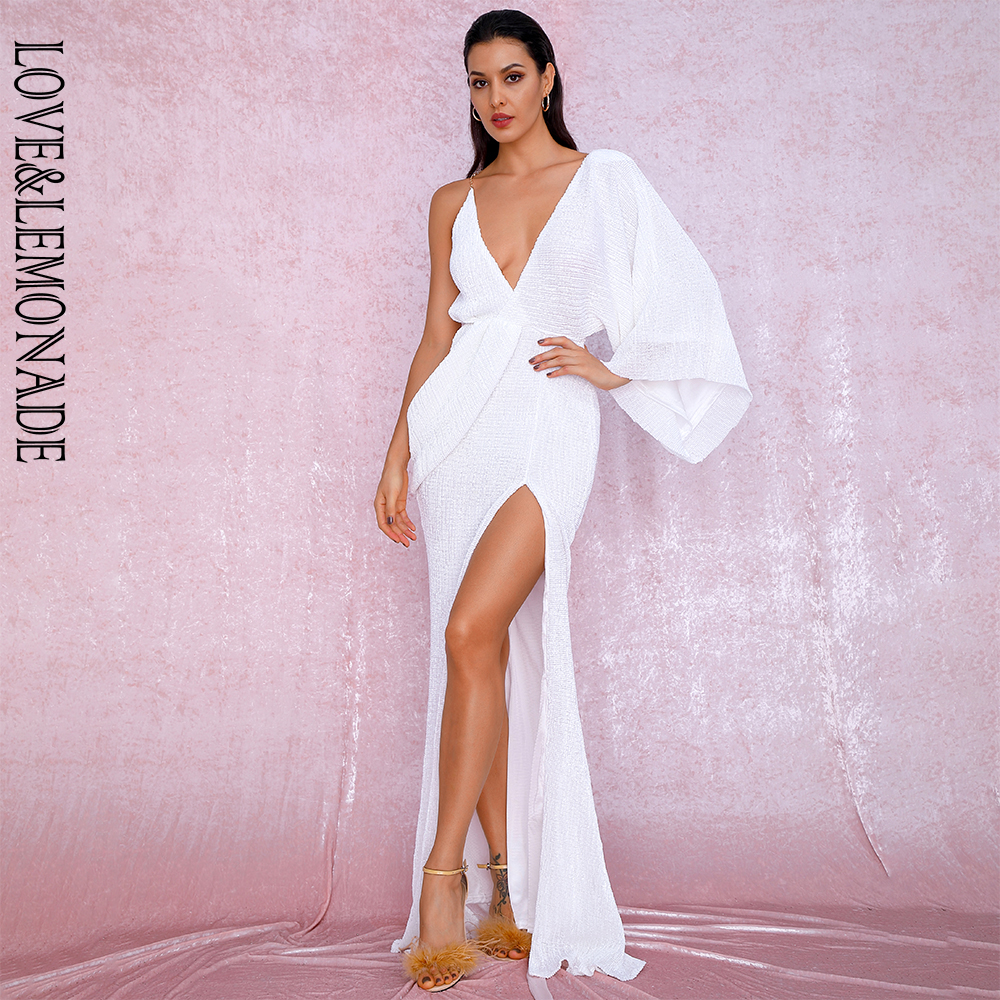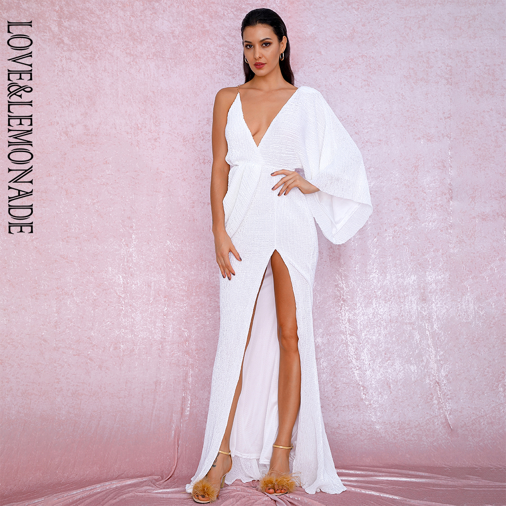FREE SHIPPING Maxi Dress White V-Neck Single Sleeve Sequins Split Party Outfit Dresses