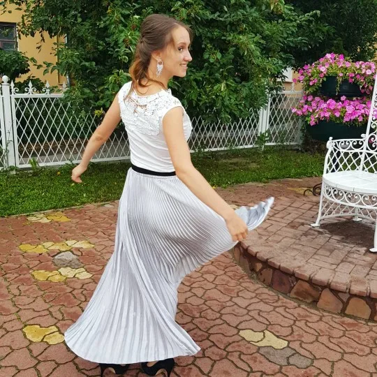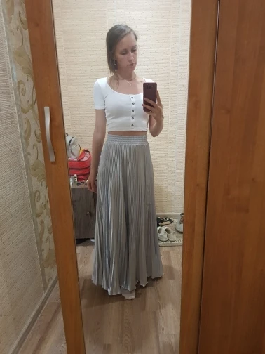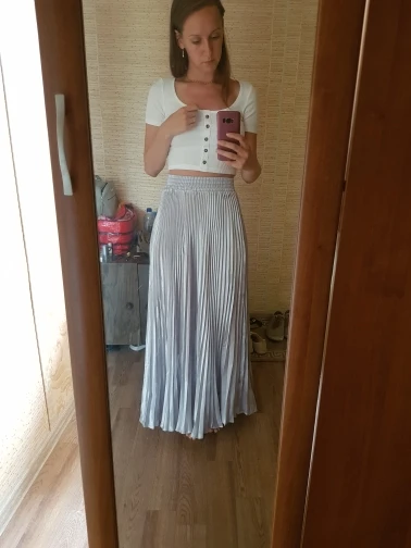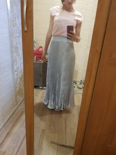 Long waited for sending. I was worried, but i managed everything, i got 3 weeks to kaluga. Now about the skirt. The size is excellent, the elastic is good, in my from 63 cm sat tight. Height 169 cm. The skirt is generally good, but you need to drive yourself to mind. I spent four hours with an iron. Came of course crumpled, the bottom of the skirt-it was a ppc (sorry not sfotkala). First i stroked, and then i had to form the folds at the bottom. And in general, i went along the entire length a little iron, so that the folds were not so strong and it was very beautifully laid down. In the photo there is before (in a t-shirt) and after (in a white top). The main thing is slightly, and then i in one place overdid, and i had to strengthen the folds (this kapets is difficult, especially on this fabric). As a result, the skirt is very satisfied.)))