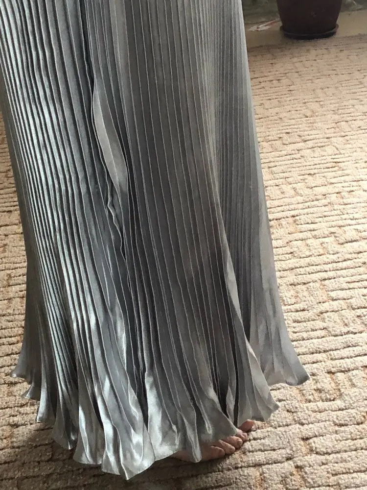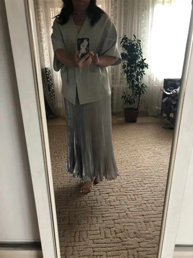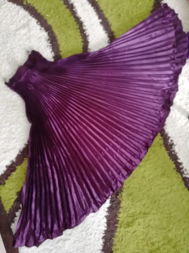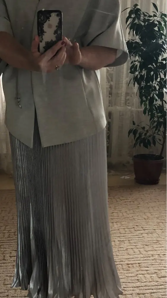 Beautiful skirt, my height is 165 cm, weight is 74 kg, the length is in the floor, on the hips slightly stretched, you will have to wear with a vest. Fabric-as in the photo, with a glitter of metallic, in one place there is a hall, it can be seen, the fold broke, i tried to steam-did not unravel, i had to gently iron and fold to do again. In general, such things need to be transported hanging, otherwise-the problem.