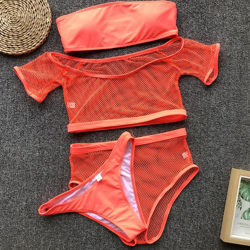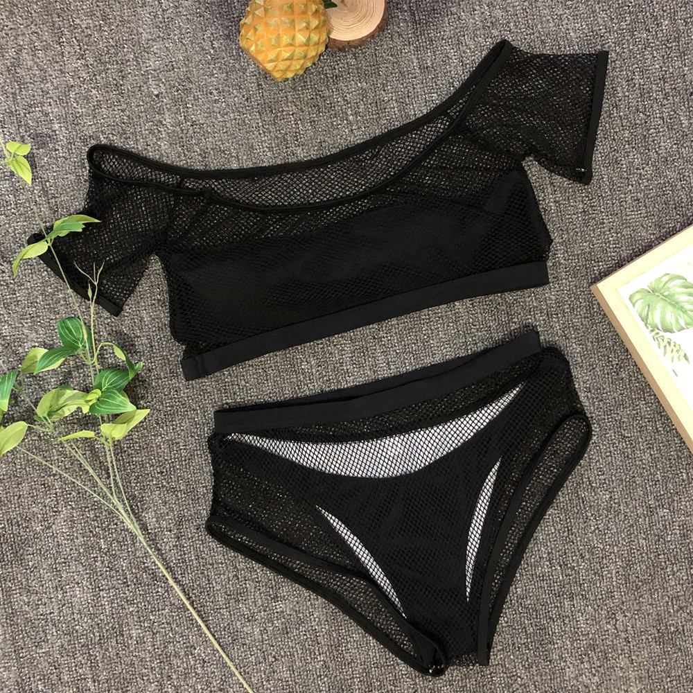 FREE SHIPPING Mesh Black Swimsuit High Waist Off Shoulder Bikini Female Push Up Sexy Swimwear Bathing Suit Bandeau Paded Solid Women JKP2387