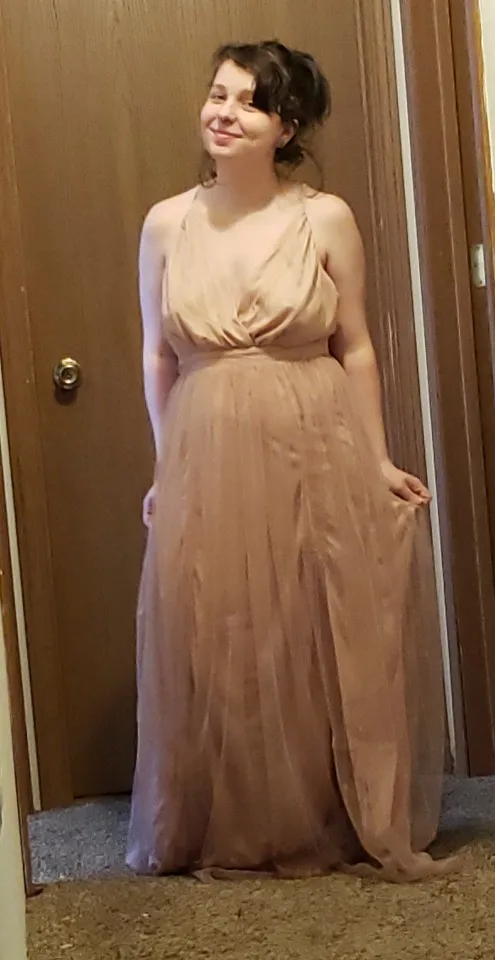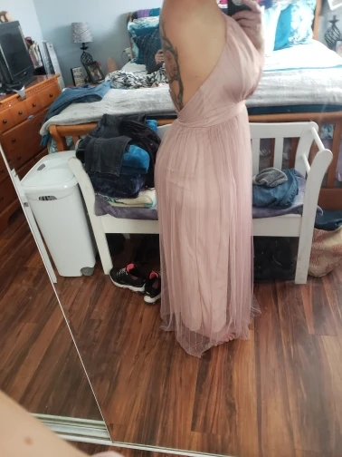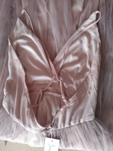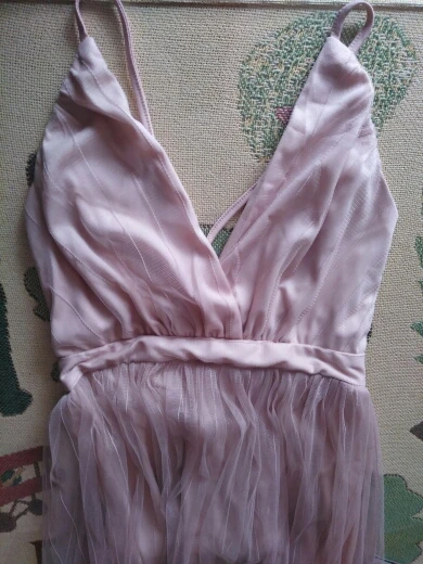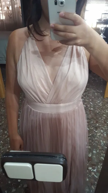 The dress is equal to the photo, it's great for the price, it stays a little large from the chest for a size s, but it can be fixed, it's very nice, very fast shipping, thank you very much!