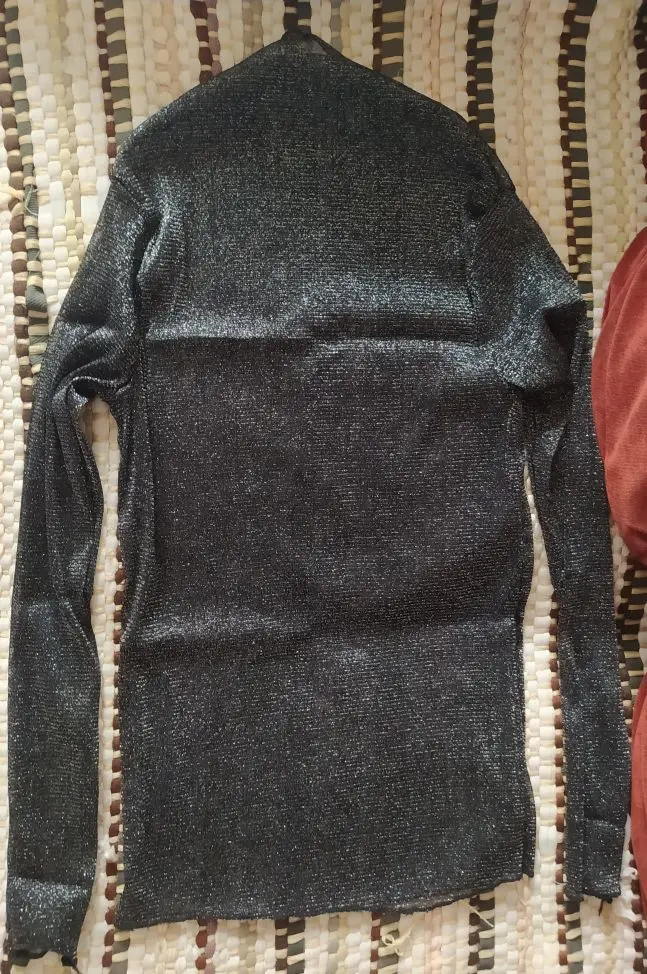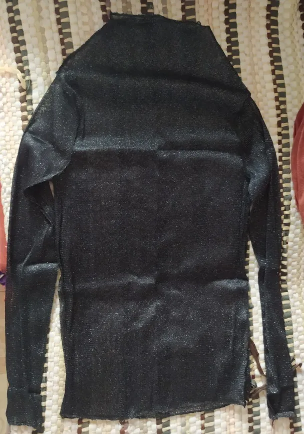Super! The mesh is dense, but pleasant to the body, does not prick, the size is maximum at 44 and a small chest. The length below the navel on the palm of your hand, the sleeve is slightly short for height 169, but almost invisible. On the throat of course torkok, but if you put inside, then it is not felt)