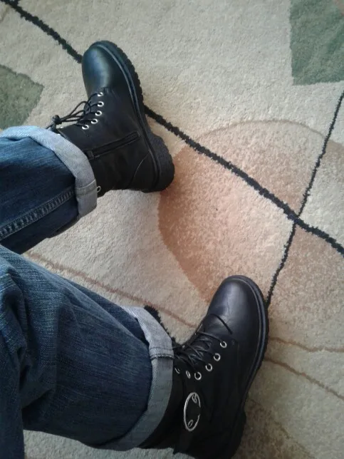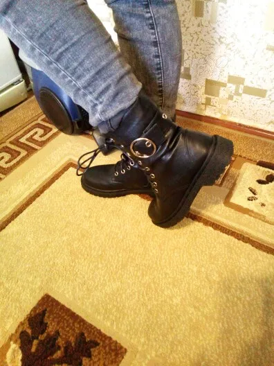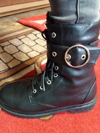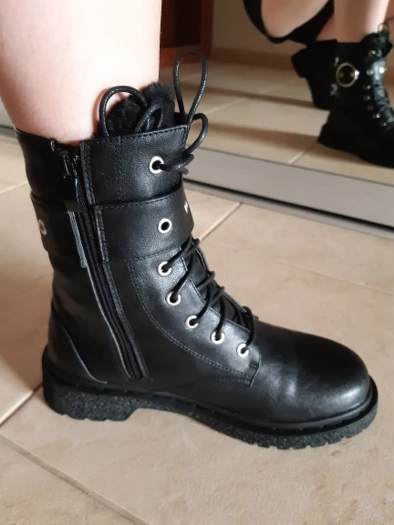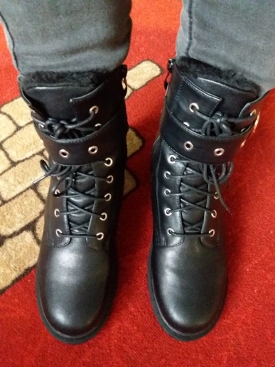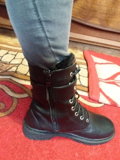 Boots are amazing. And the price is not expensive, they are in addition they are comfortable On my narrow leg 24.5 cm, i took the size 8 (24.5 cm). If it was an autumn option, i would definitely take 7.5. Since the leg is narrow, i always take a smaller size. I bought it for the winter with fur, so i took the size in size. i came very well and even there is a place for a warm sock. Heel height 3 cm, shaft height with heel 21 cm. Material top leather. zam. Inside is thick black fur. Fastened with a zipper on the inside of the leg. There are laces and a strap with eyelets on the ankle. So the lacing and strap are customized to your leg circumference. And all, now take off and dress shoes conveniently with a zipper.