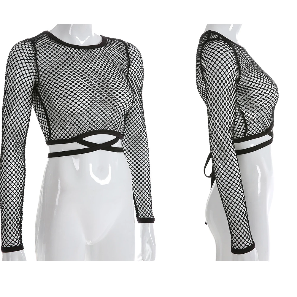 FREE SHIPPING New Sexy Women See through Hollow out Perspective Sheer Mesh Fishnet Tee Bodycon Long Sleeve Tops Beach T Shirt Cropped JKP1877