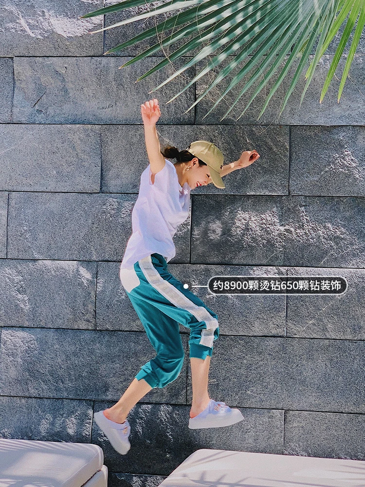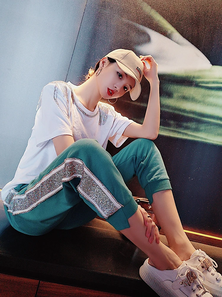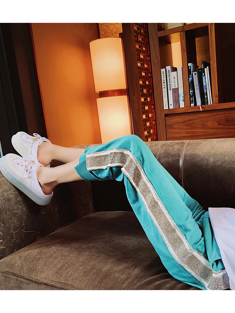 FREE SHIPPING New Spring Summer Loose Women Long Trousers Solid Color Green Casual Female Pants Ankle-length Hot Drilling Sweatpants JKP1933