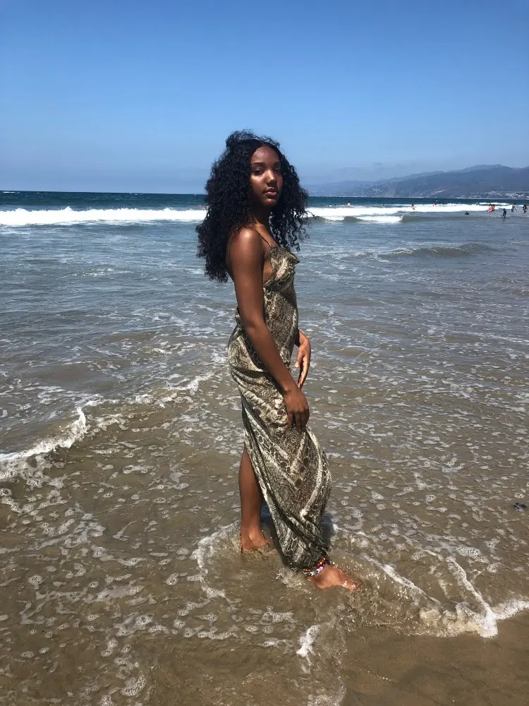 So prettyyyyyy! I am 125 lbs and 5ft and it feels great (a tad long) it looks sheer but it’s not when you put it on . I’m so obsessed how flowy yet forming it is to my body