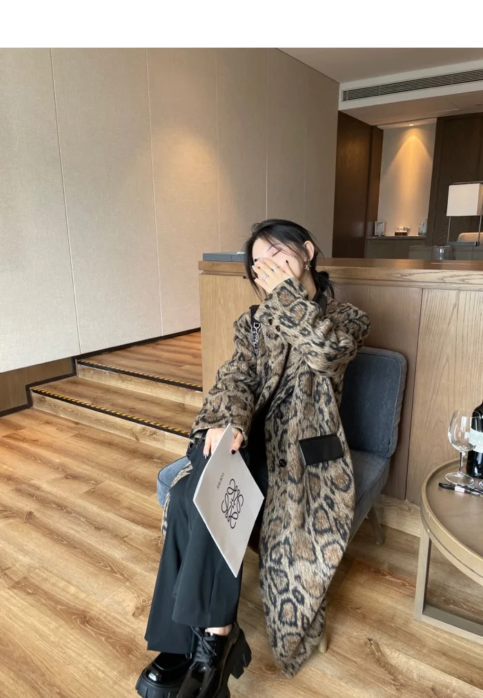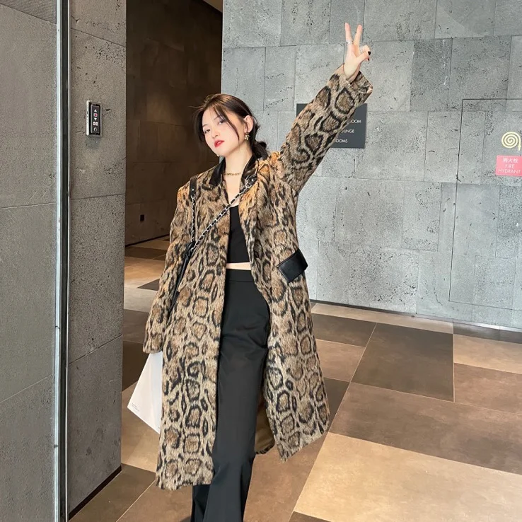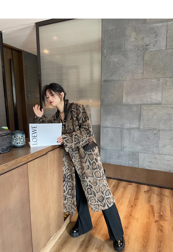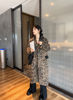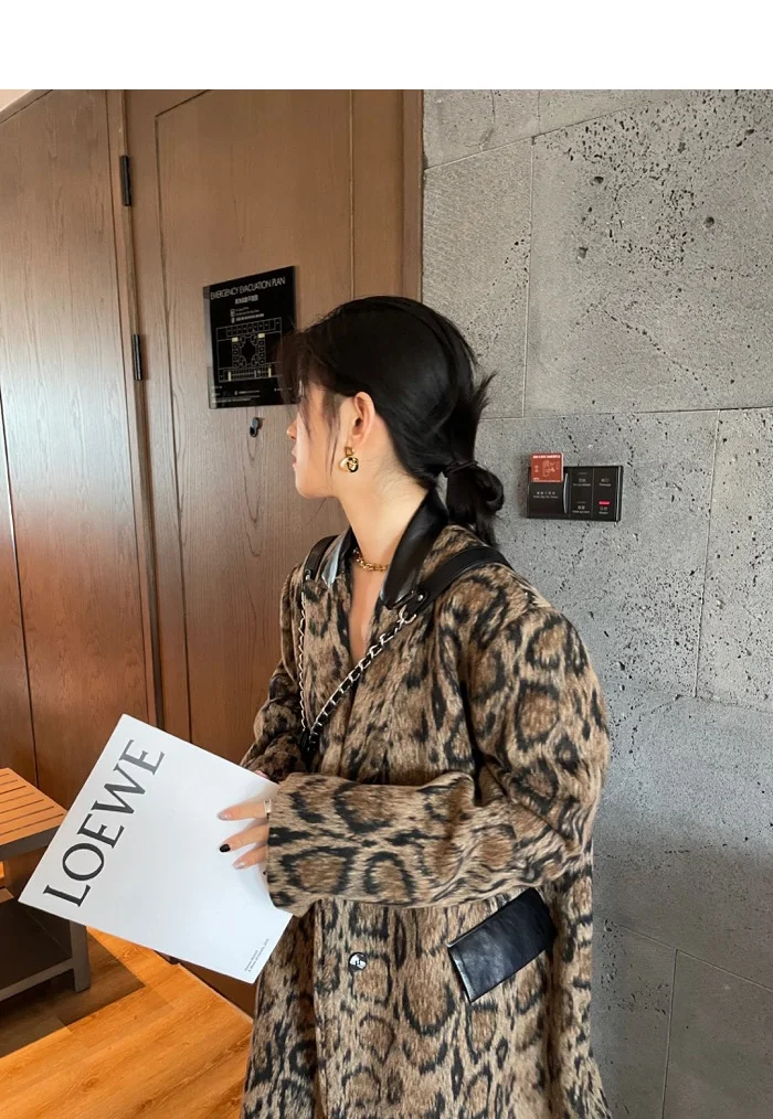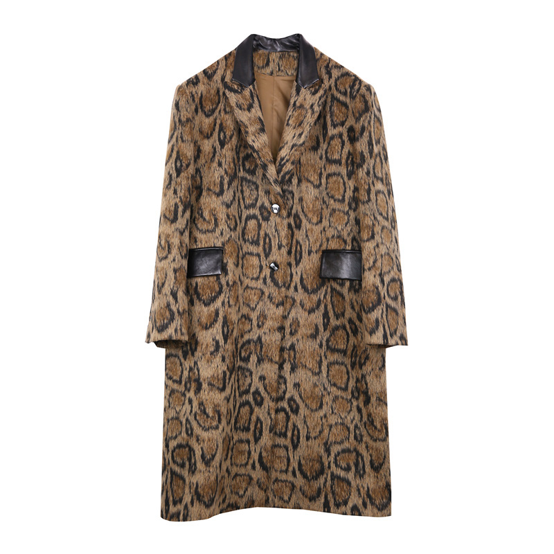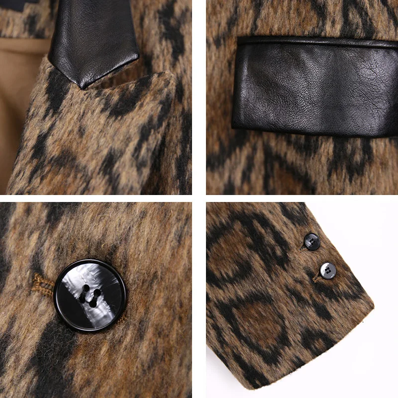 FREE SHIPPING New Winter Woolen Coat Women Brown Spliced Snake Printing Black PU Midi Coats JKP6042