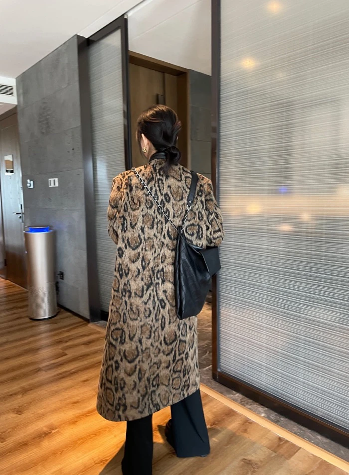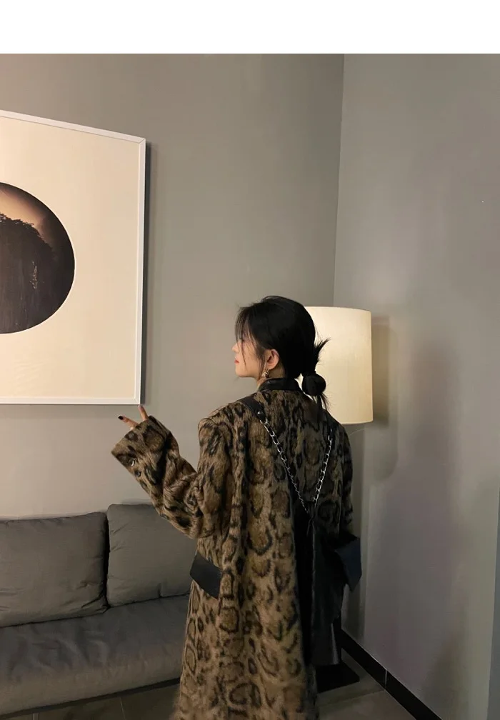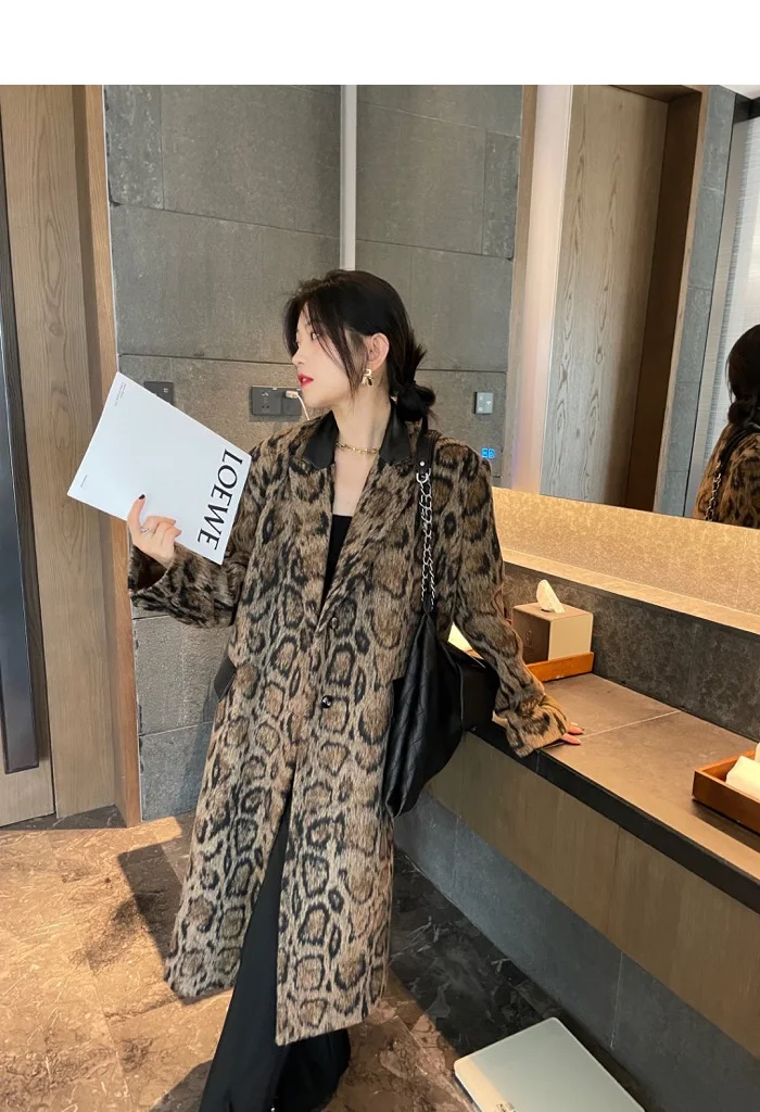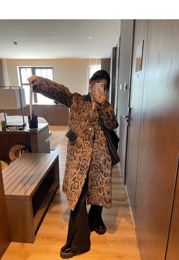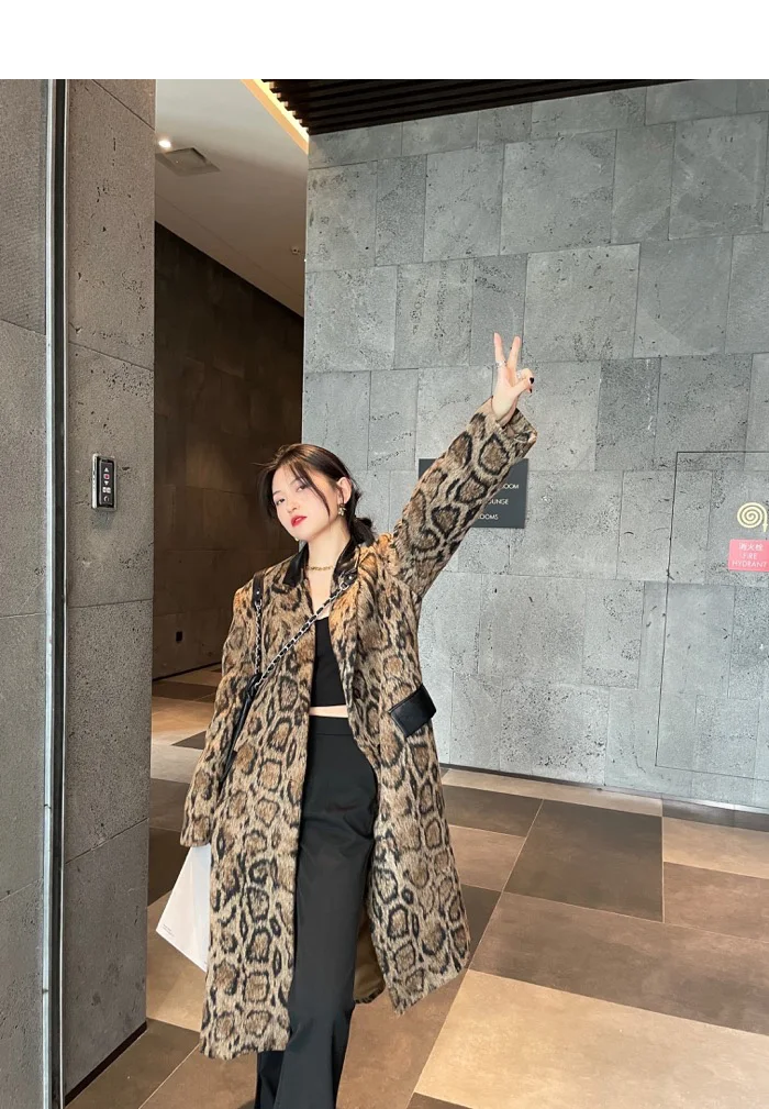 FREE SHIPPING New Winter Woolen Coat Women Brown Spliced Snake Printing Black PU Midi Coats JKP6042