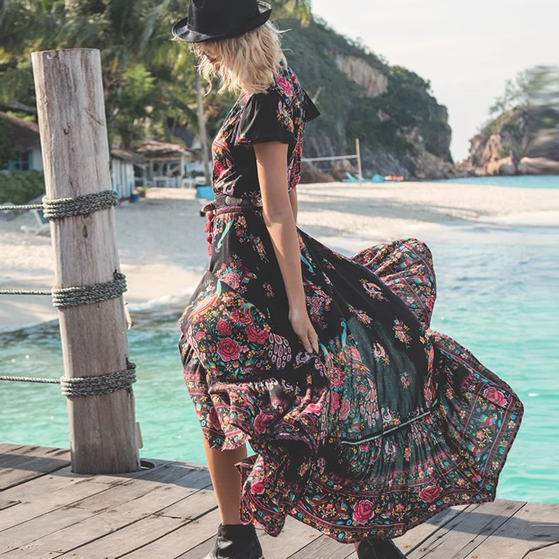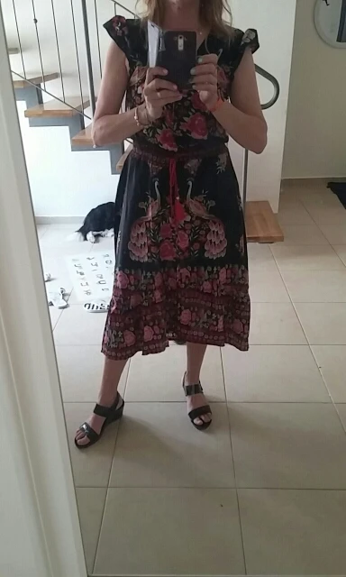 light and thin fabric.synthetic.quiet warm fir summer but because that the dress is bright it is ok.longer in the back than in the front side.i am 173 high and weight 66 took L and fits perfect.there is a litlle problem with the waist area: the elastic band makes like an open place on the stomac.i puted a security needle nobody sees it and it hold on the dress.i recommend the dress and the store