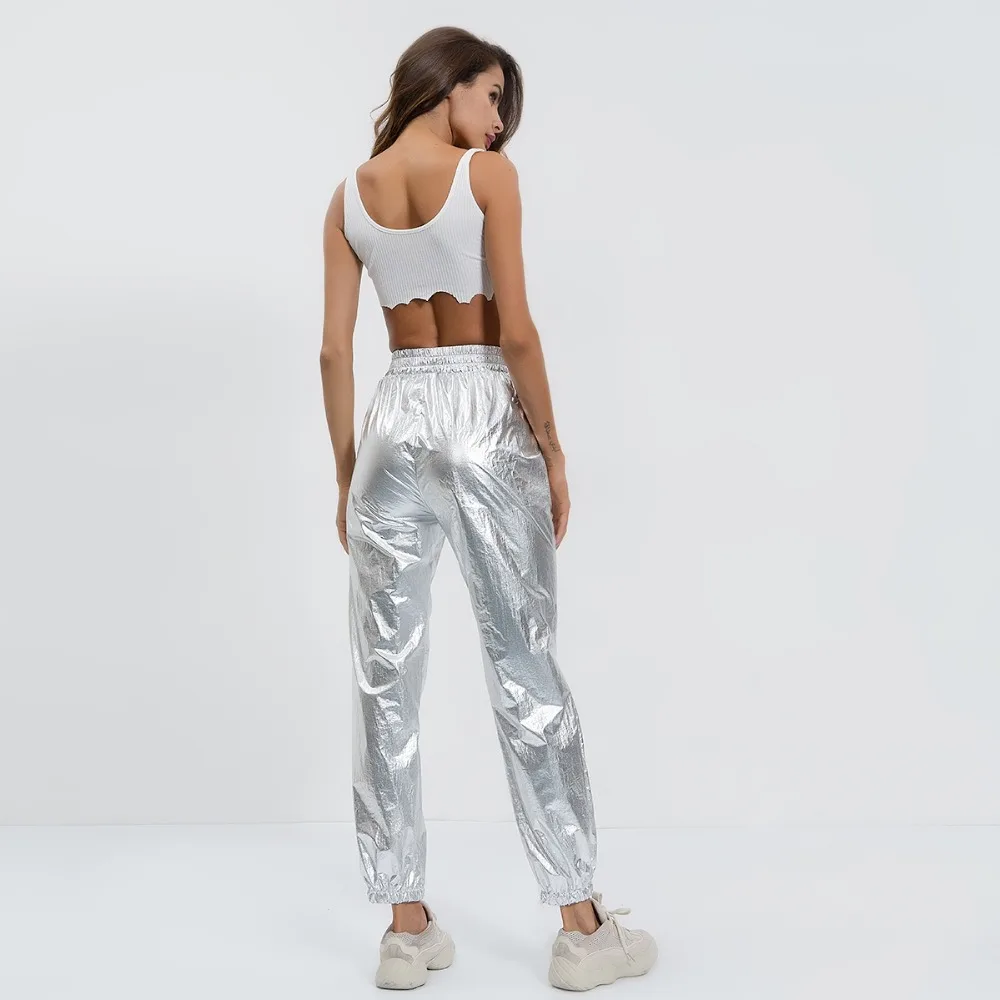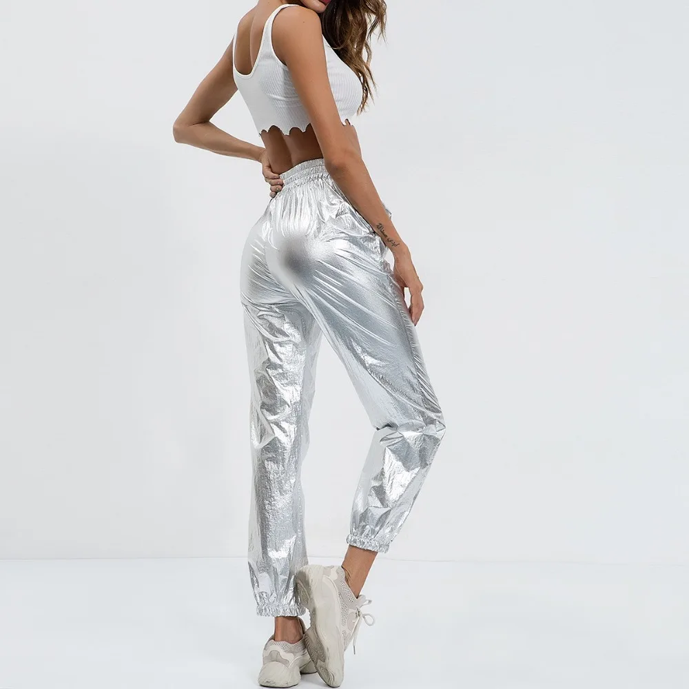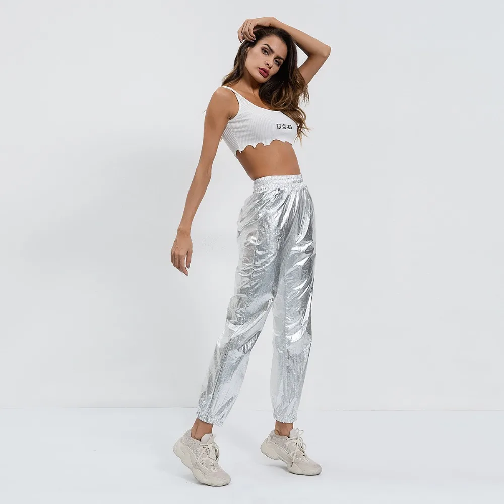 FREE SHIPPING New Women Summer Pants Streetwear Silver Reflective Loose Hip Hop Hearm Pants Women High Waist Trousers Long Pants JKP1928