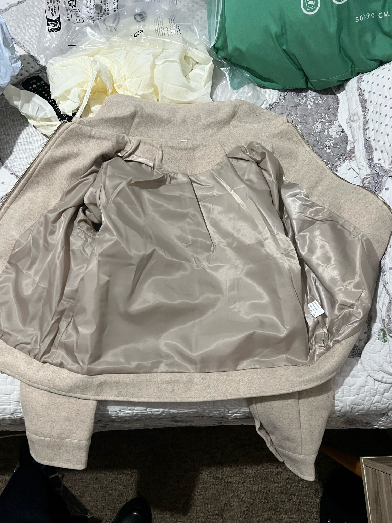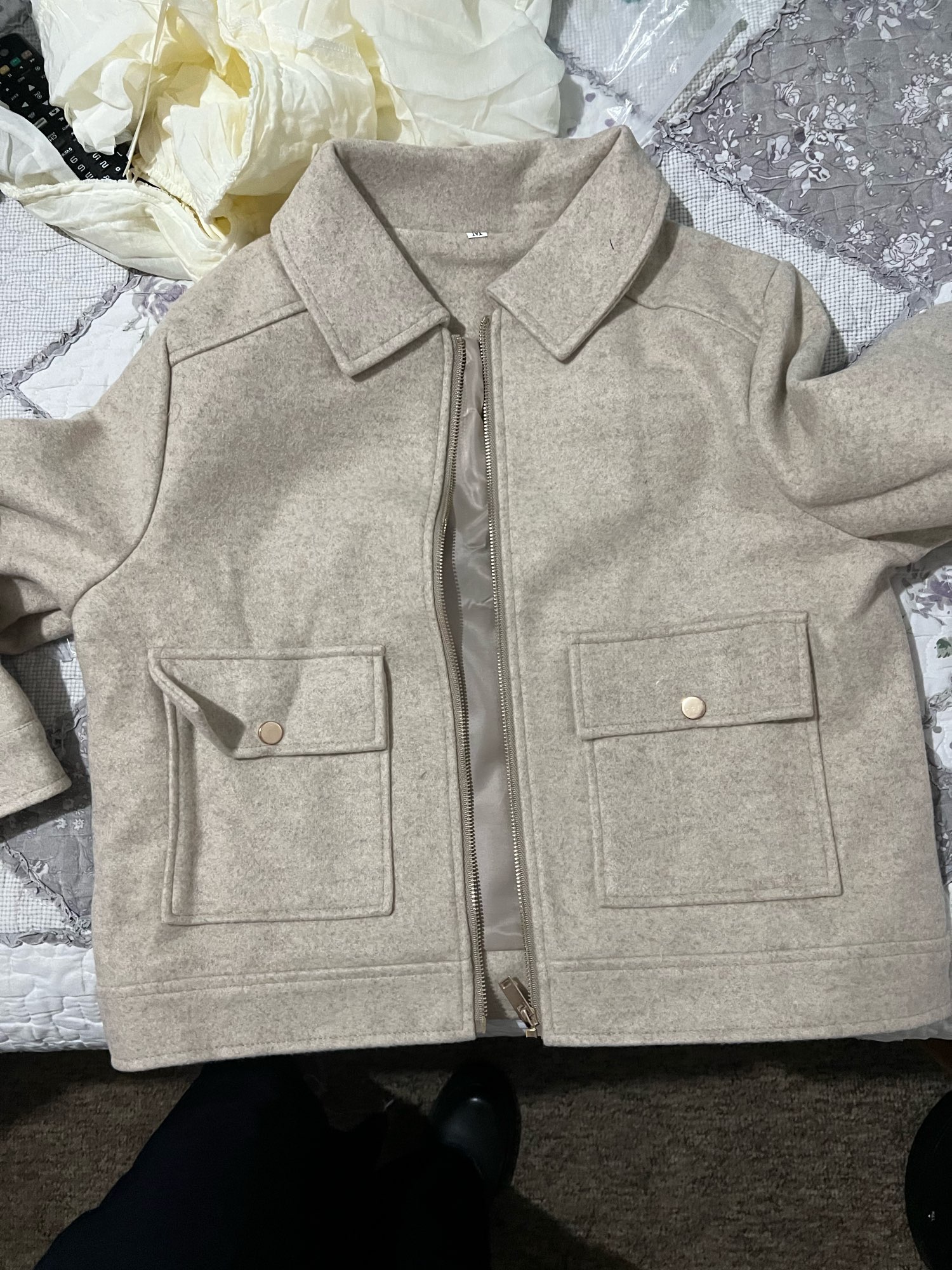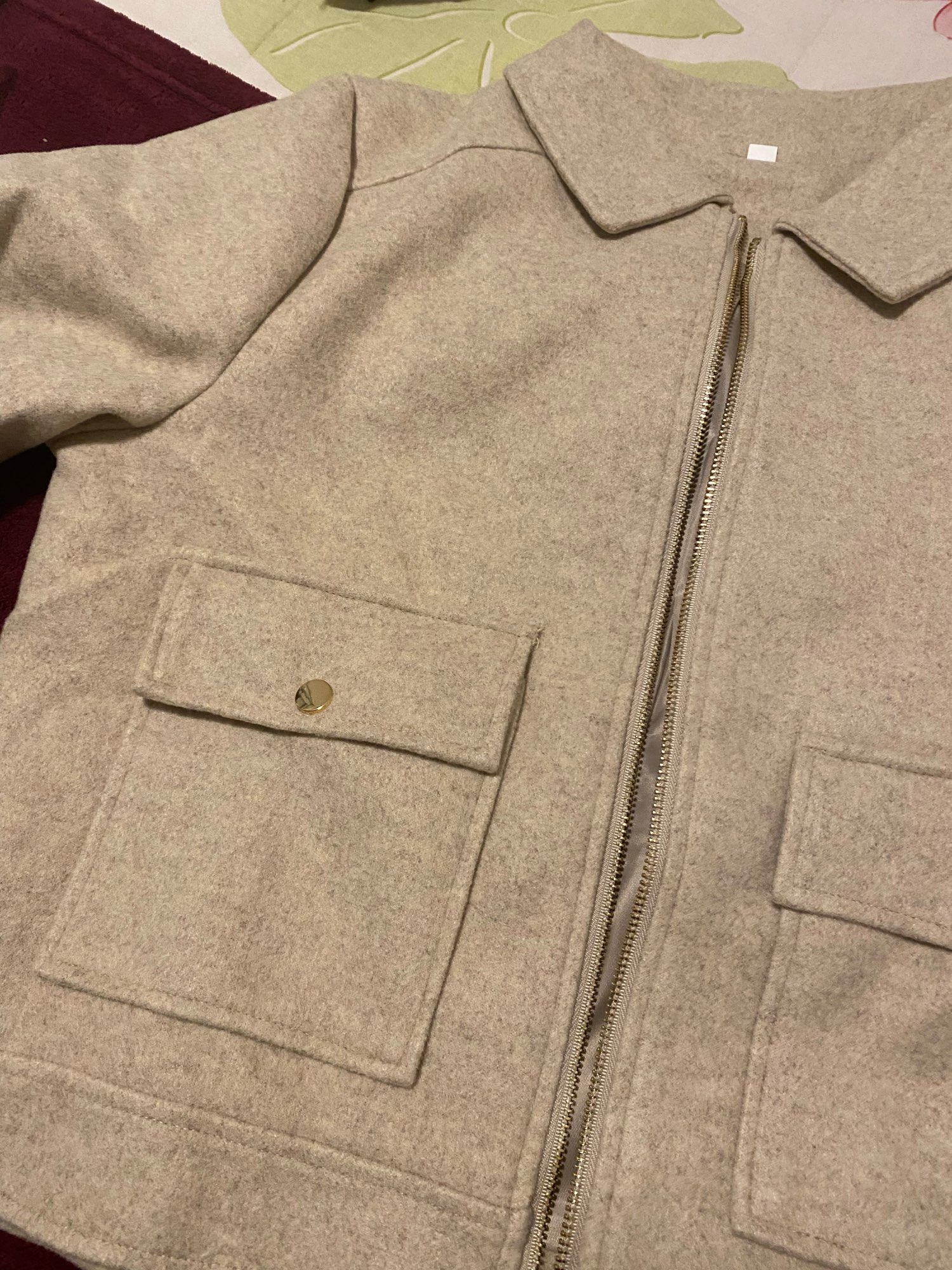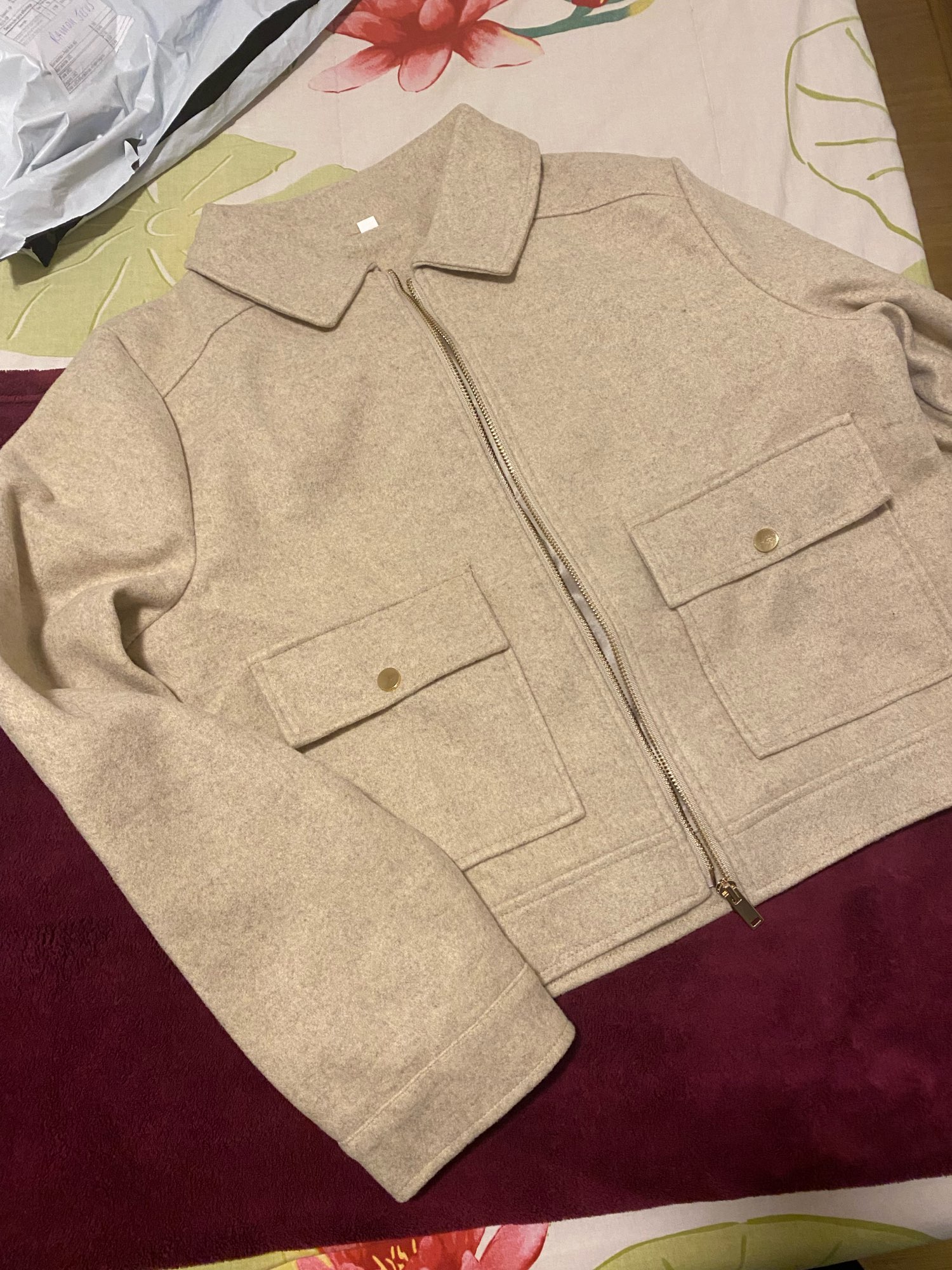 The jacket is very beautiful, it met my expectations. Good finish, soft fabric, warm. I bought size M according to the measurement chart and it fits correctly. It arrived 1 week earlier than the expected time.