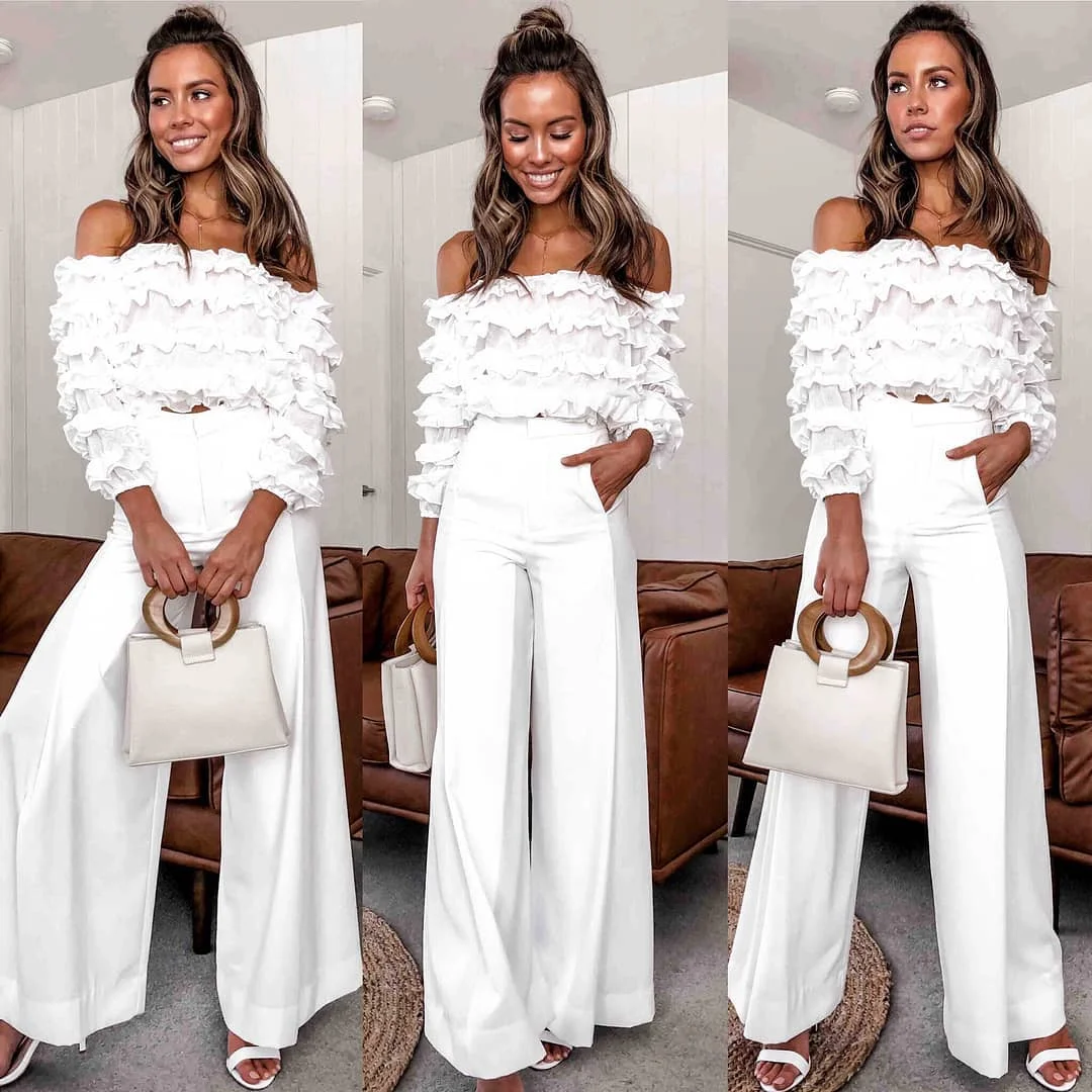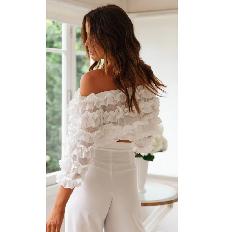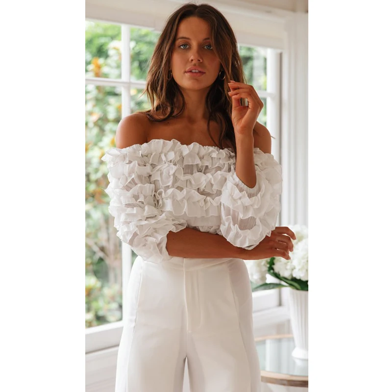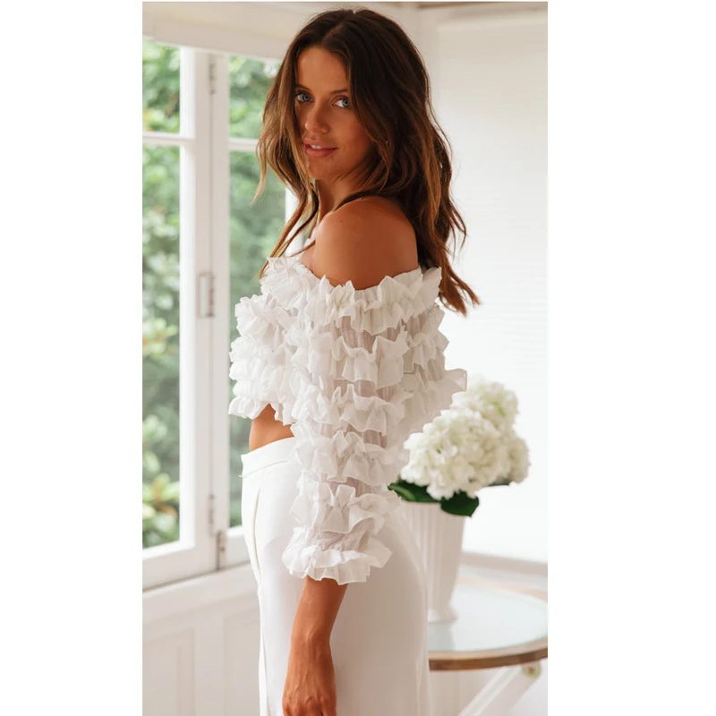FREE SHIPPING Off Shoulder Lace Petal Floral Blouse Shirts Womnen Three Quarter Lantern Sleeve Slash Neck Blouses blusas mujer de moda JKP2746
