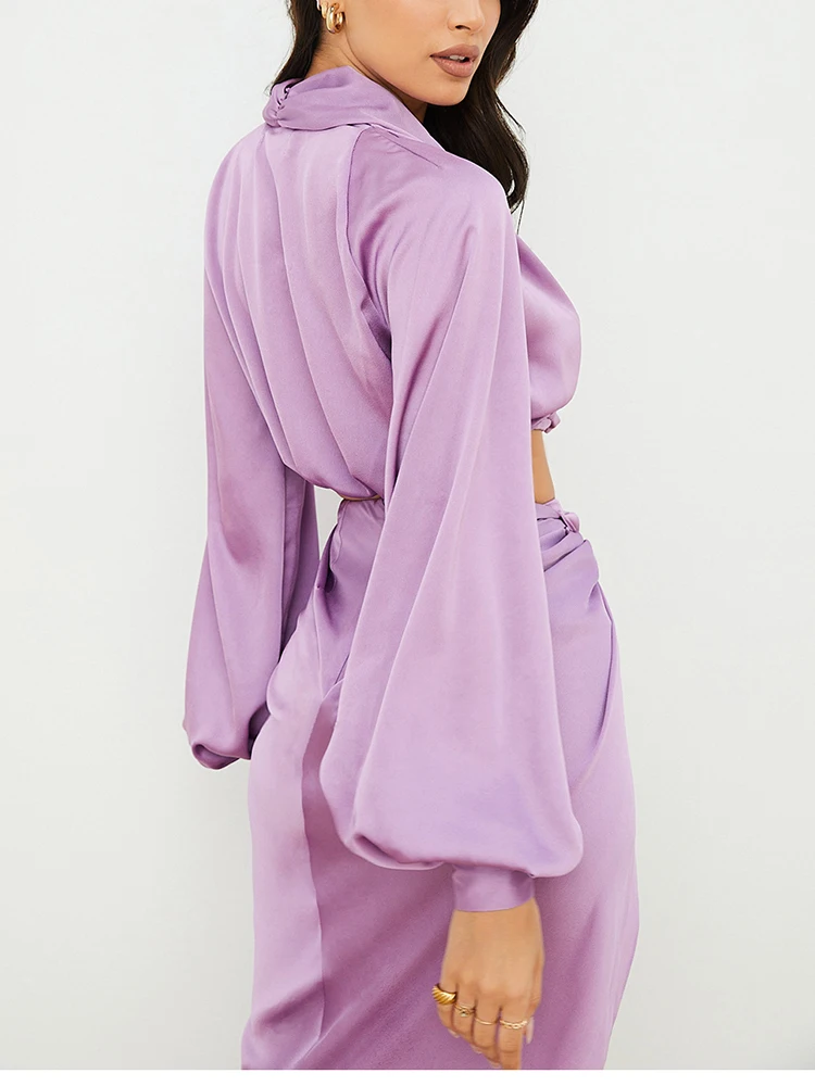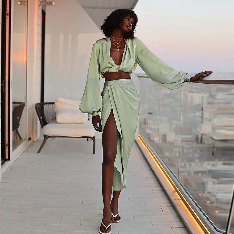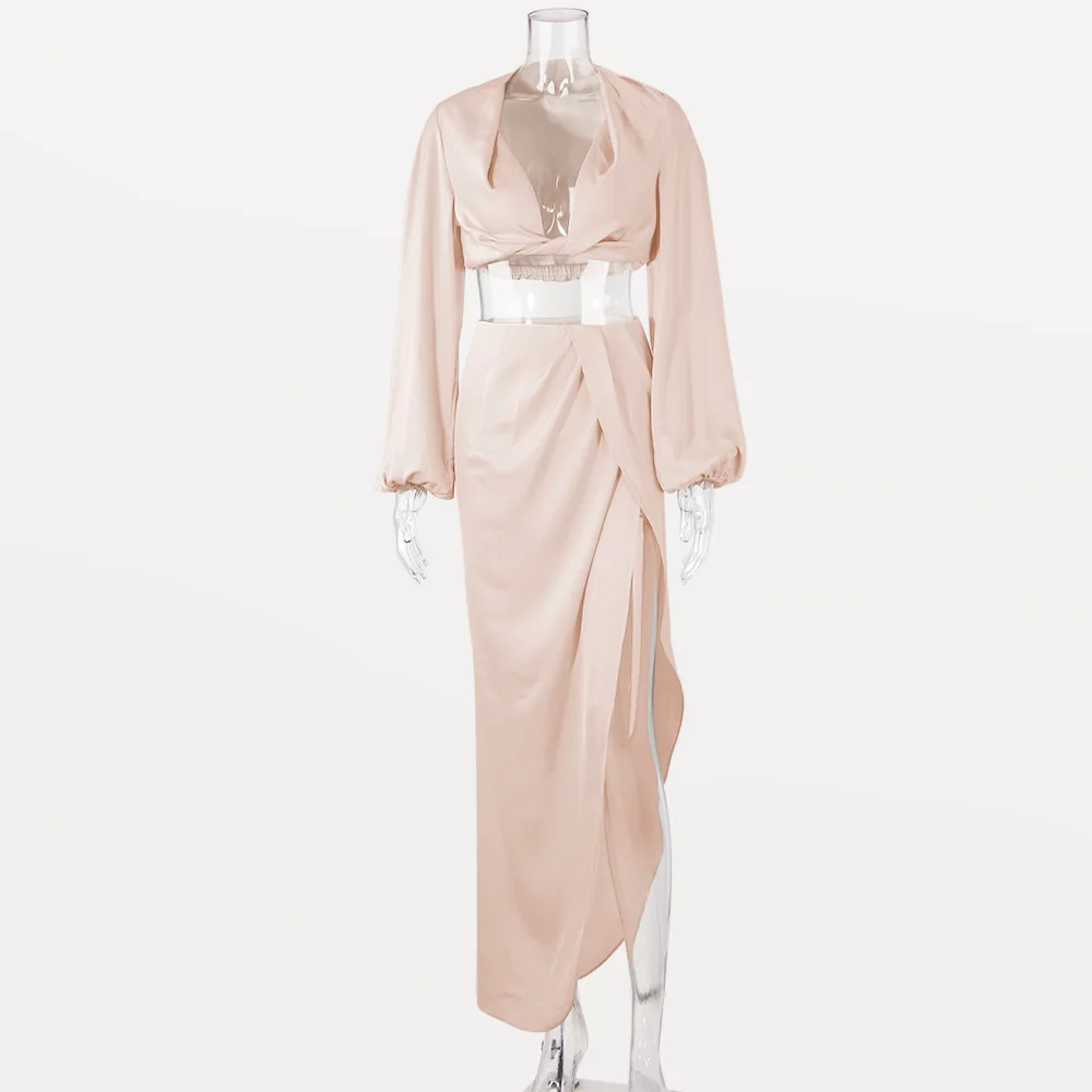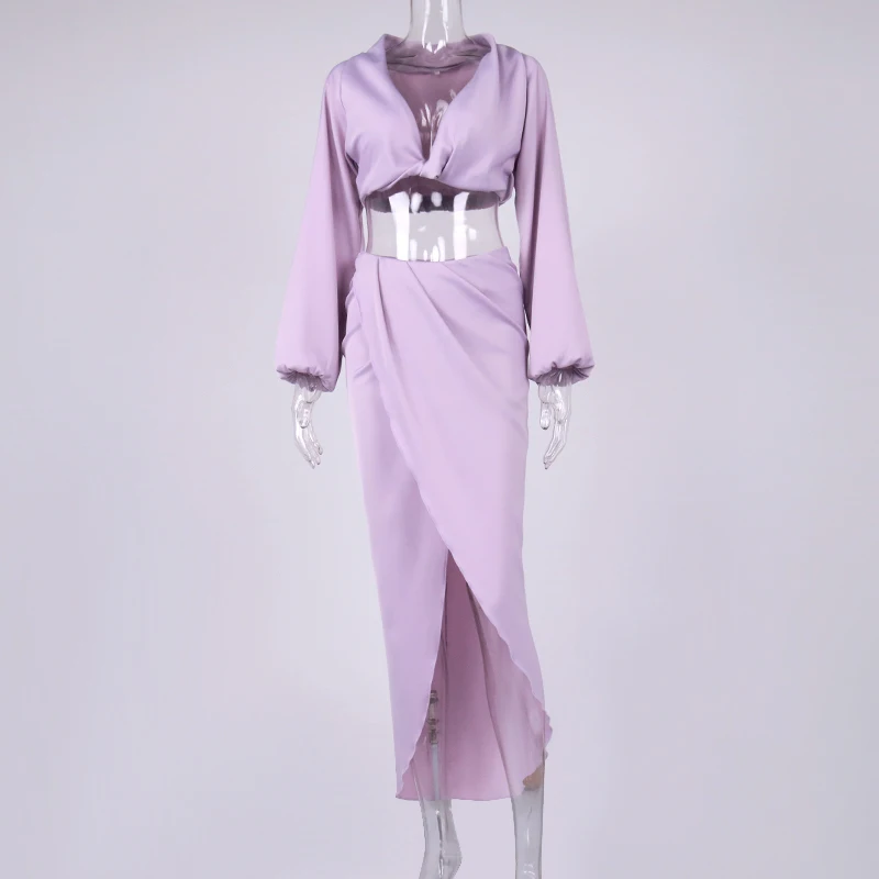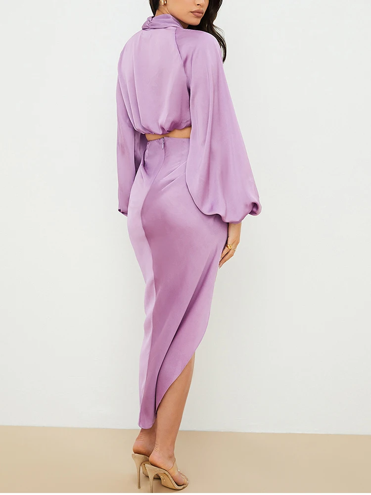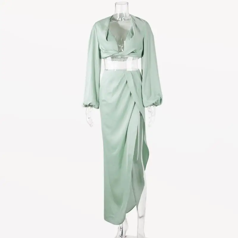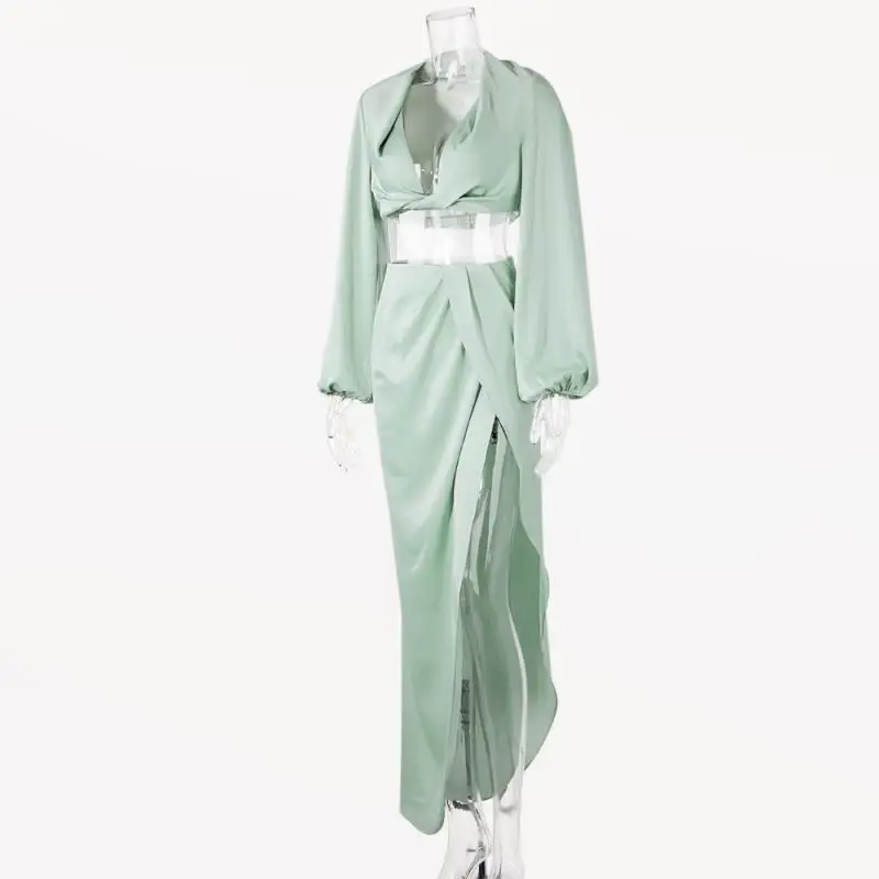 FREE SHIPPING Outfit Dress Satin Long Lantern Sleeve Crop Top And High Split Long Skirts Two Piece Set JKP5919