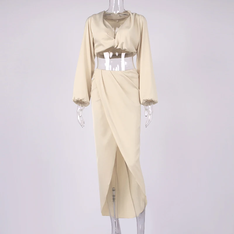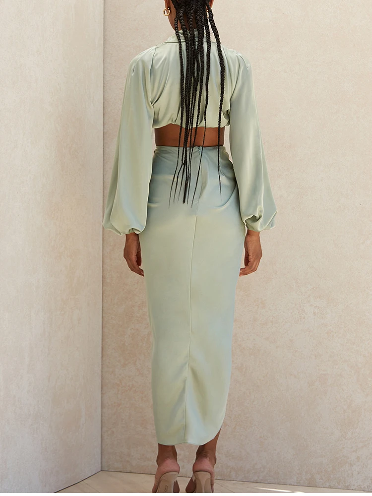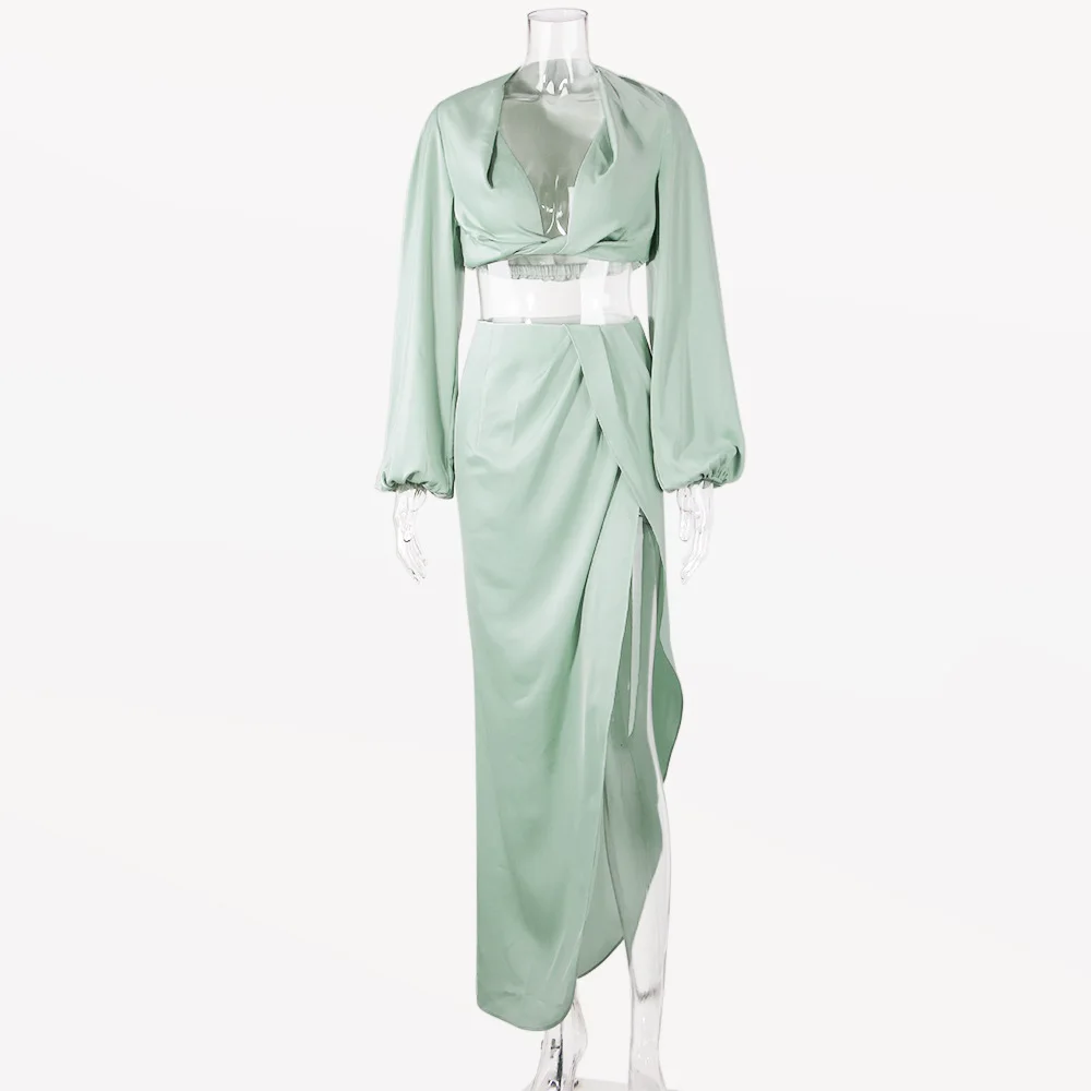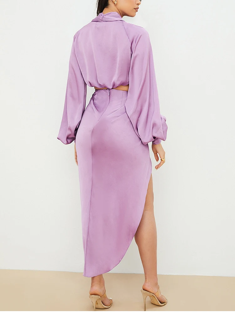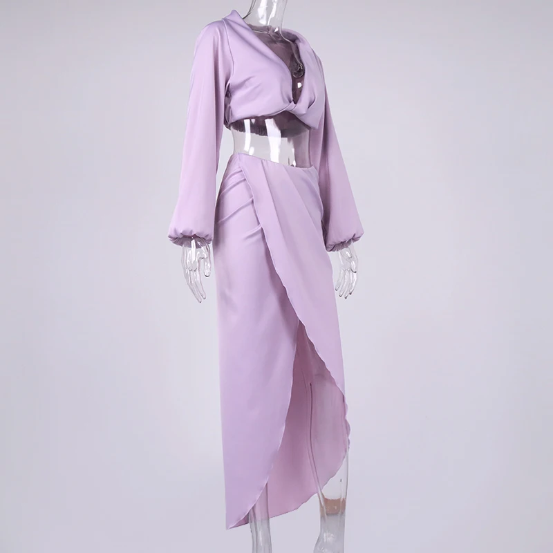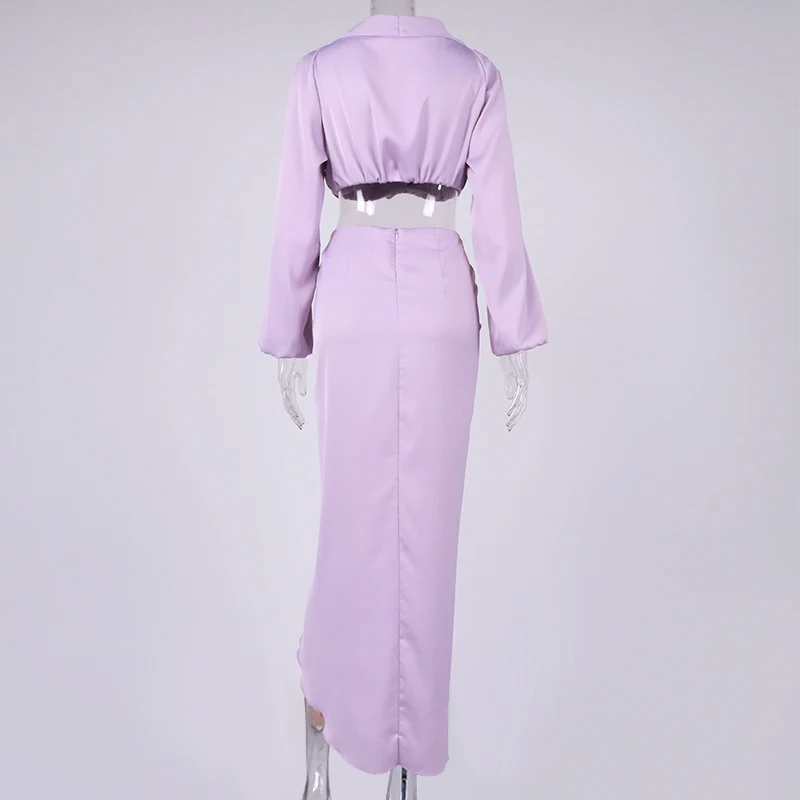 FREE SHIPPING Outfit Dress Satin Long Lantern Sleeve Crop Top And High Split Long Skirts Two Piece Set JKP5919