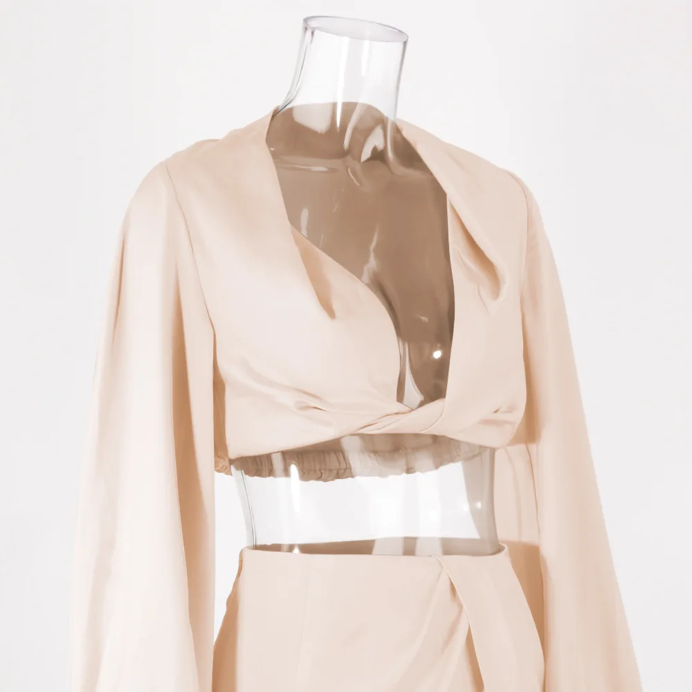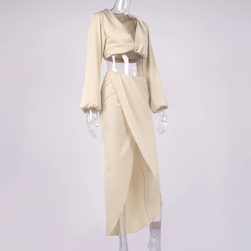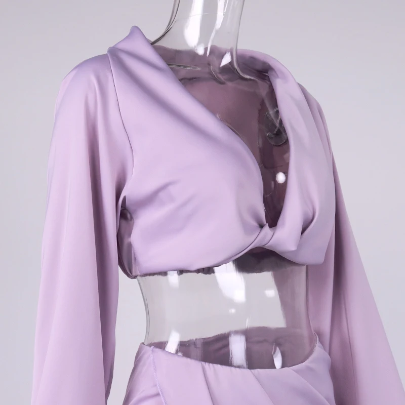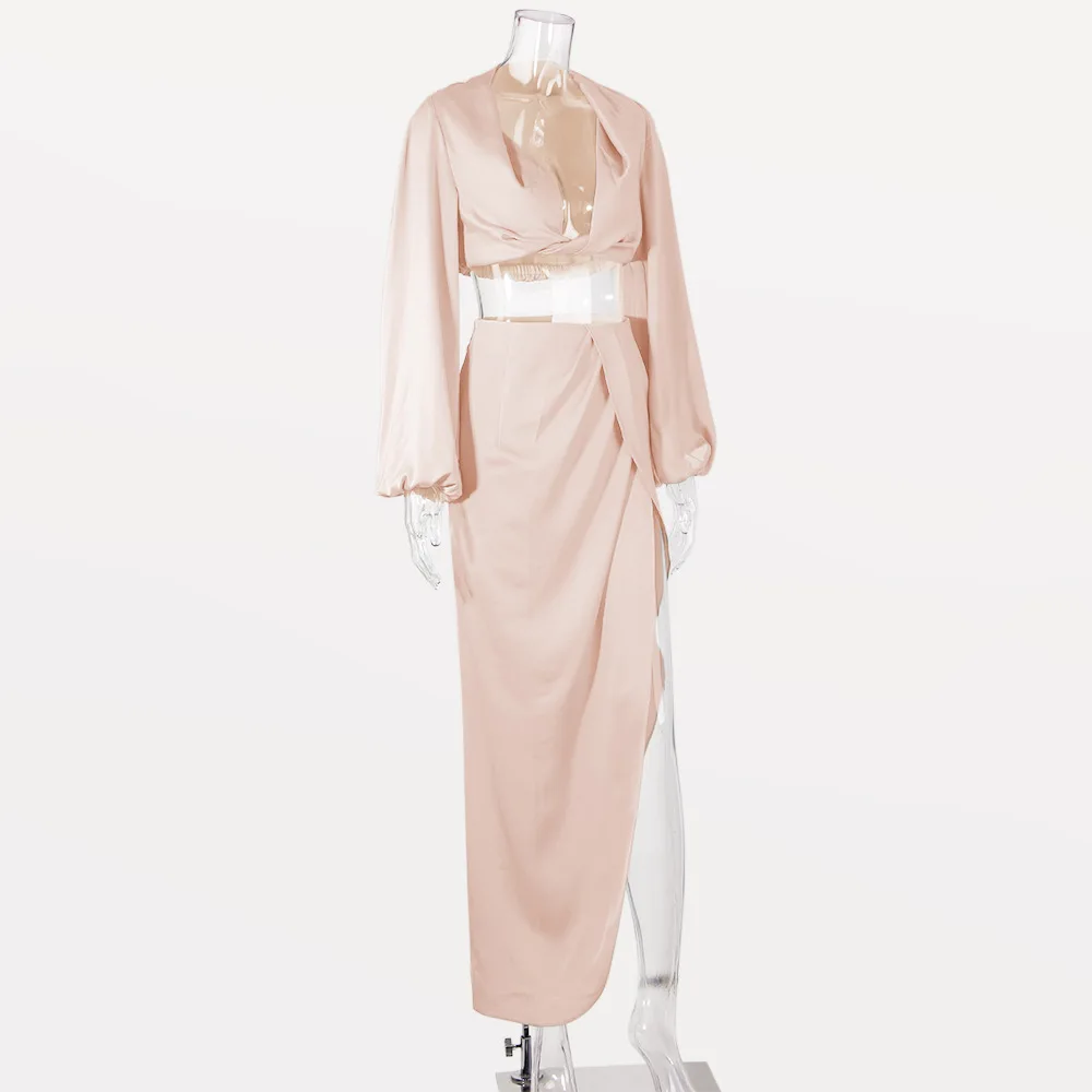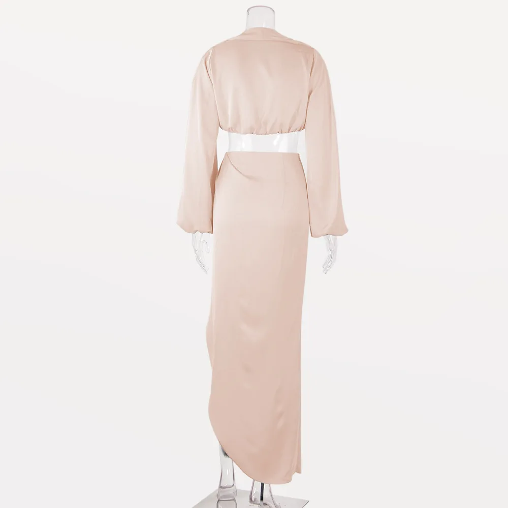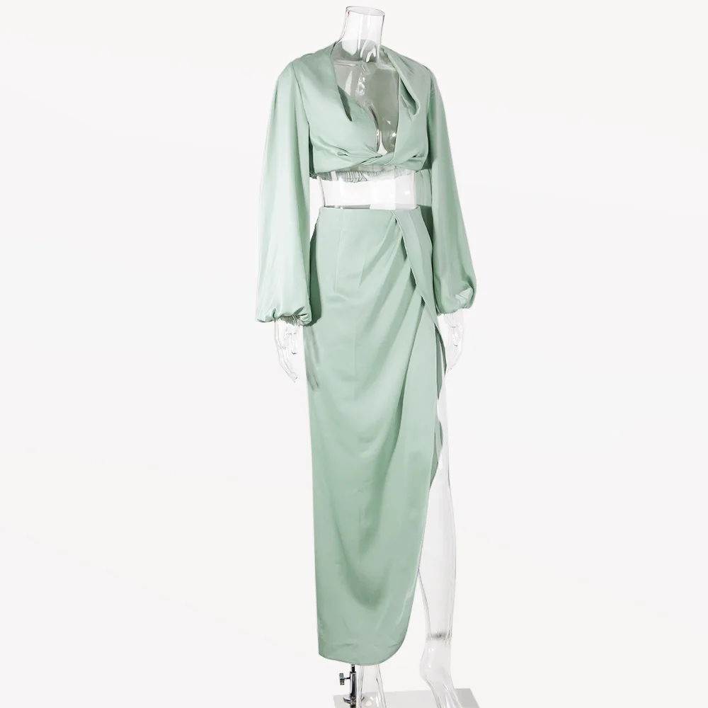 FREE SHIPPING Outfit Dress Satin Long Lantern Sleeve Crop Top And High Split Long Skirts Two Piece Set JKP5919