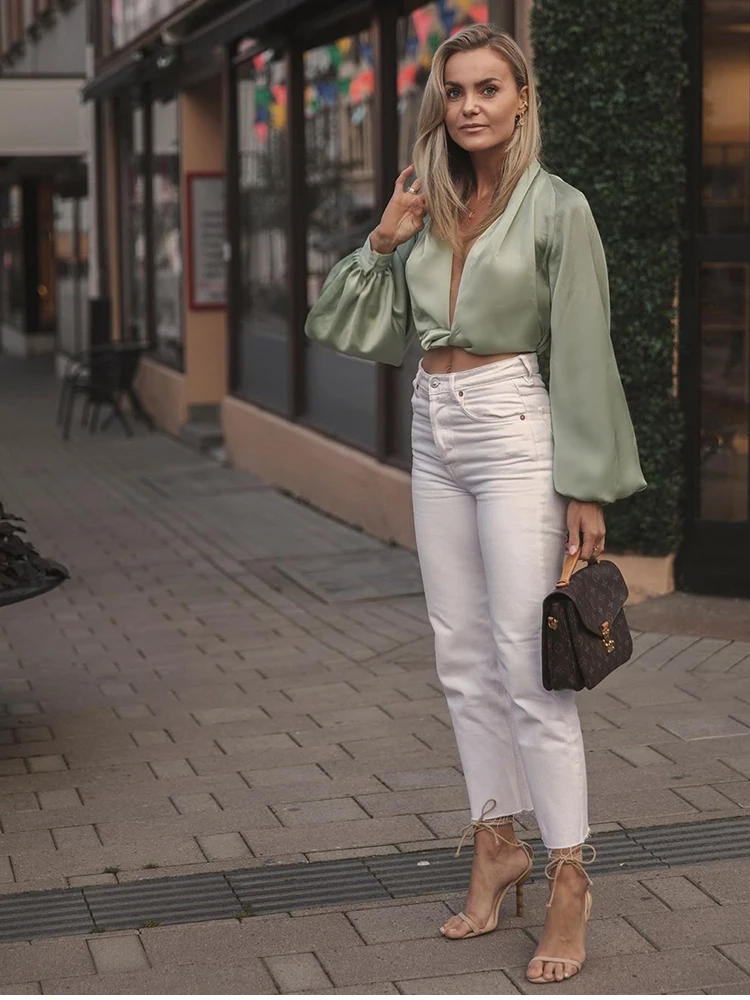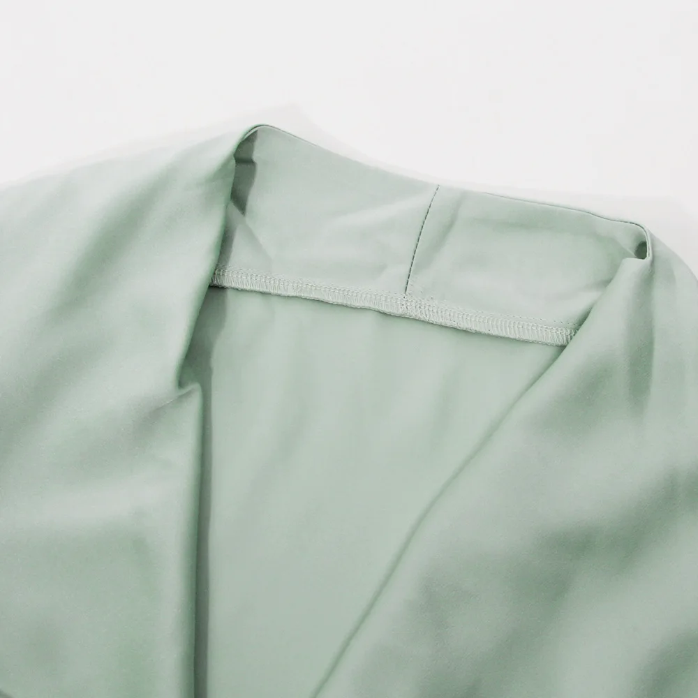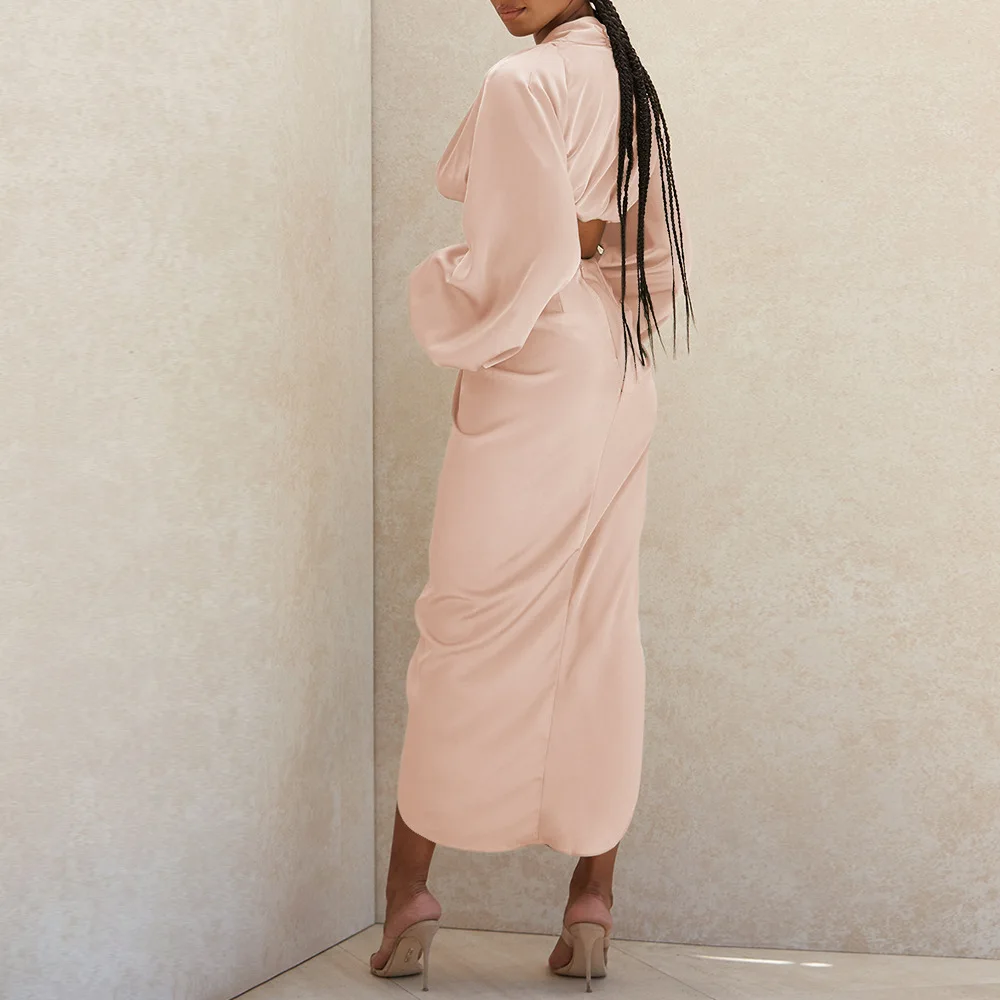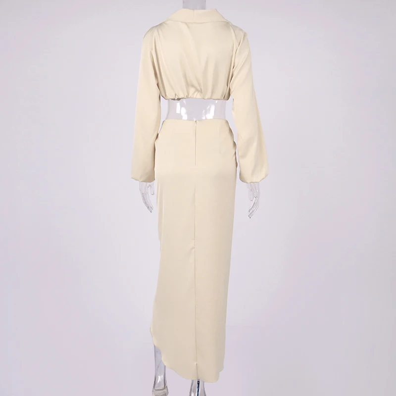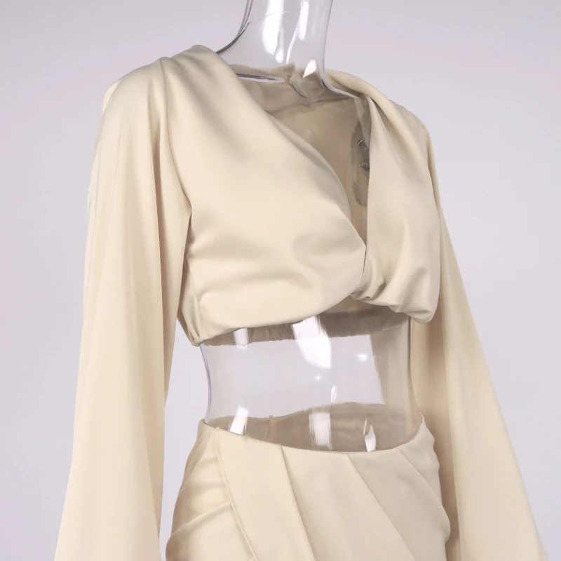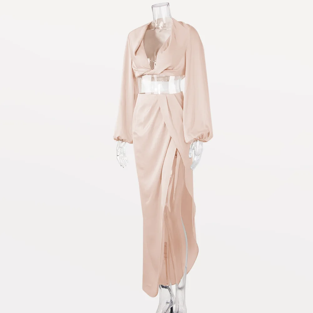 FREE SHIPPING Outfit Dress Satin Long Lantern Sleeve Crop Top And High Split Long Skirts Two Piece Set JKP5919