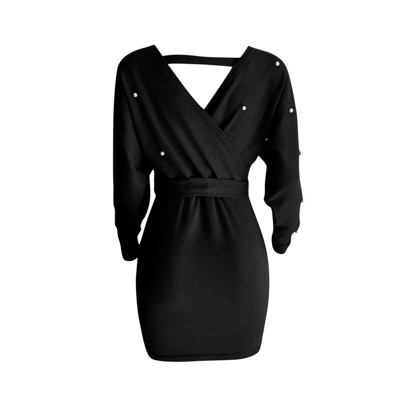 FREE SHIPPING Pearls Wrap V Neck Off Shoulder Long Sleeve Bodycon Dresses JKP1155