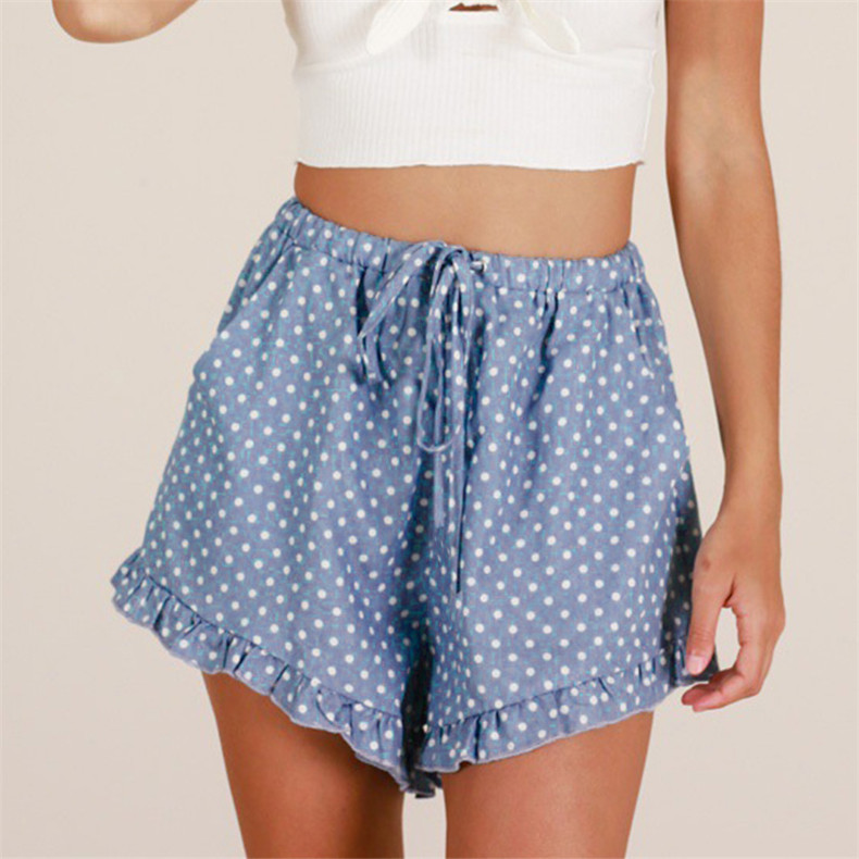 FREE SHIPPING Polka Dot Mini Summer Shorts Women Blue Ruffle Elastic Waist Plus Size Wide Leg Casual High Waist Shorts JKP2222