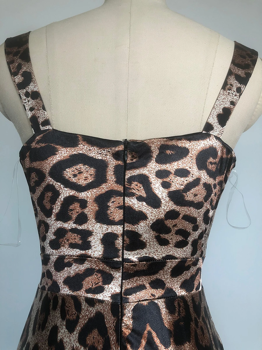 Woman wearing leopard print bodycon midi dress with bustier neckline and wide straps.