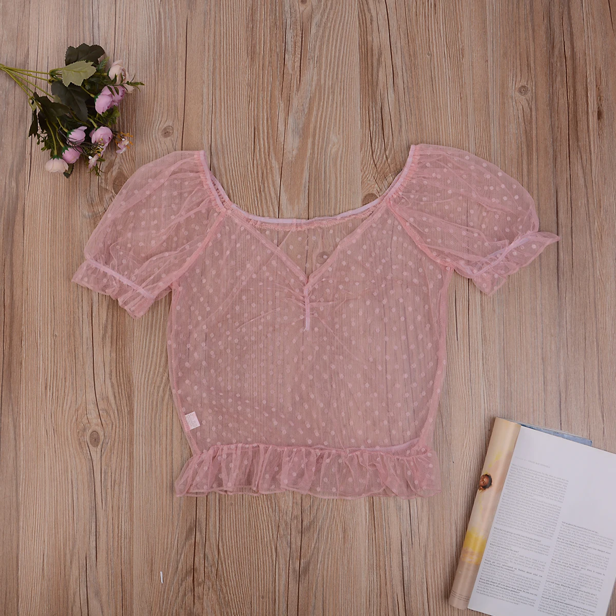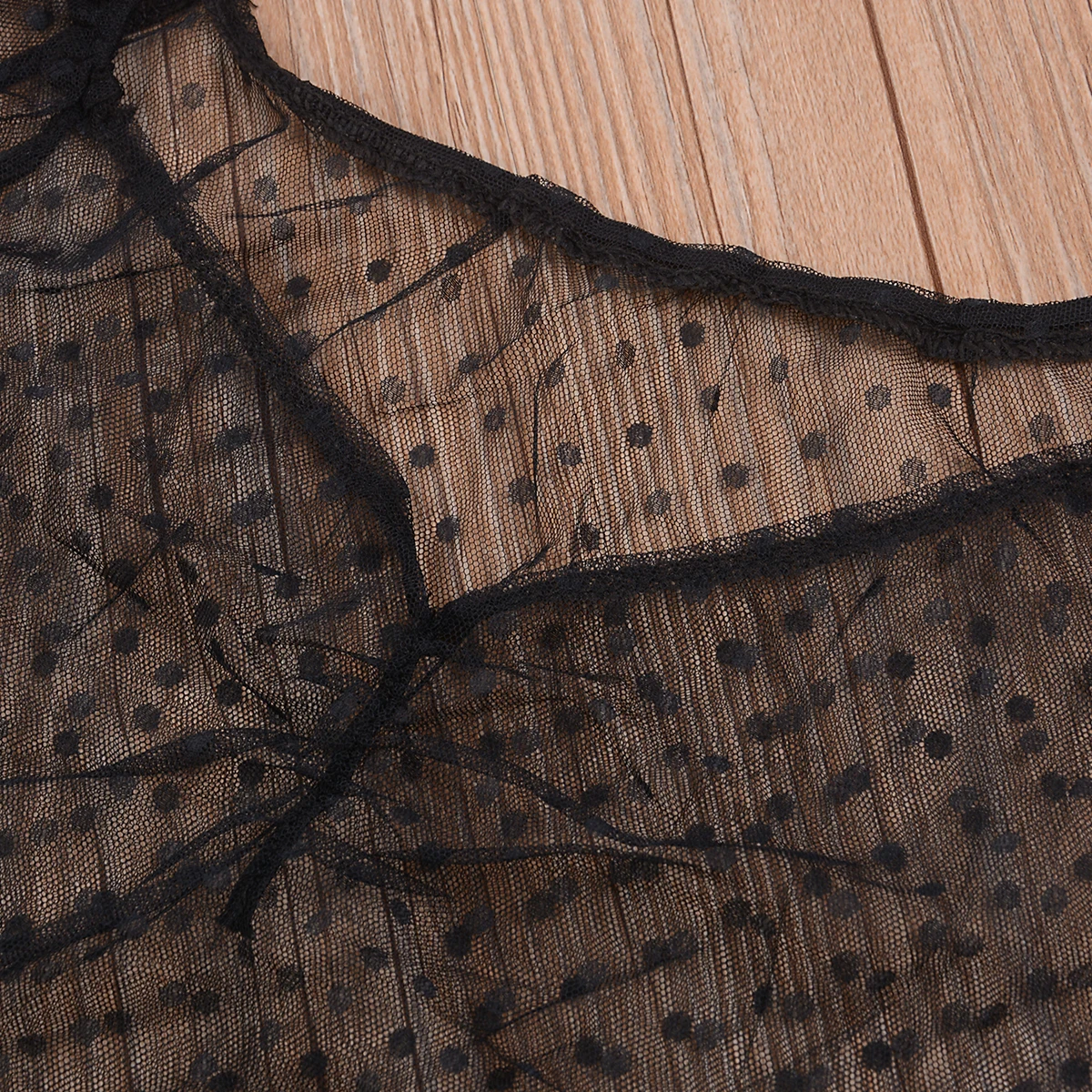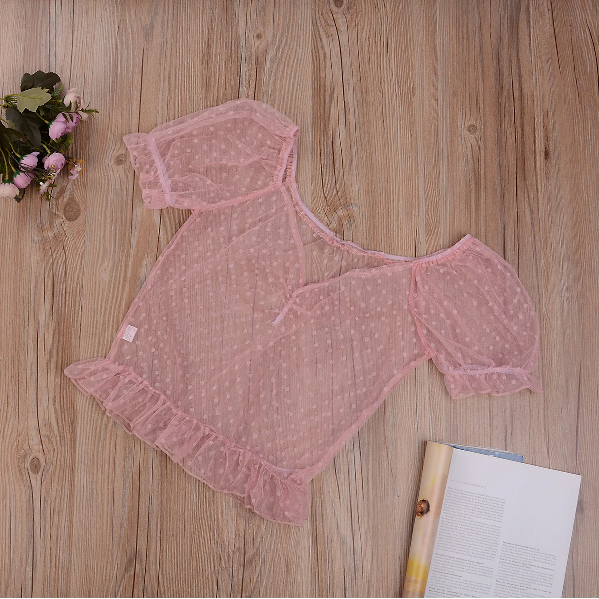 No stretch, when putting it on be very careful because i heard some of the threads make a strained sound. The elastic isn't too tight. 84cm bust, 66cm waist, 167cm height. The sheer fabric is so lovely and the dots and ruffles show up well. It's a little itchy on the skin but wonderful when you layer it. So cute, I wish there was more colors. The pink is a little dustier than in the stock image. No bad smells, one loose thread.