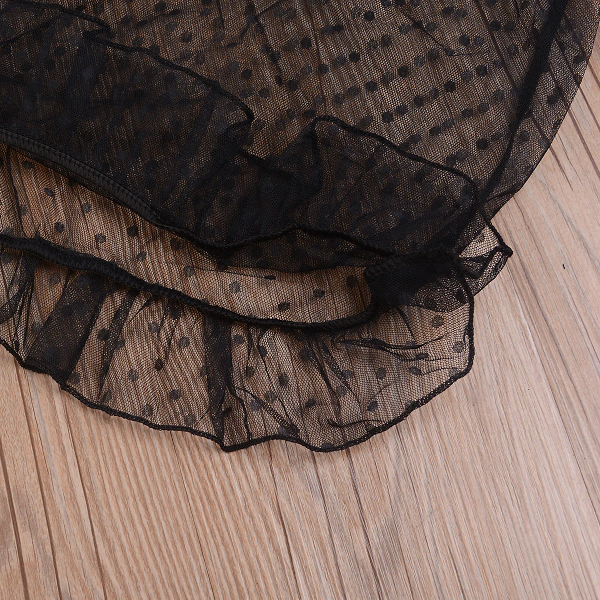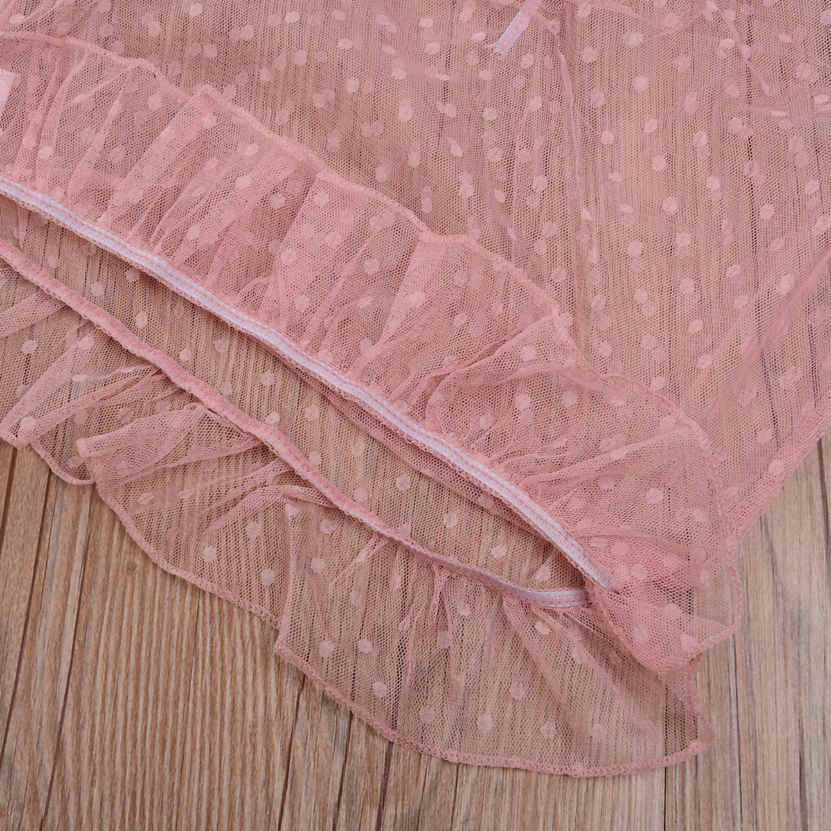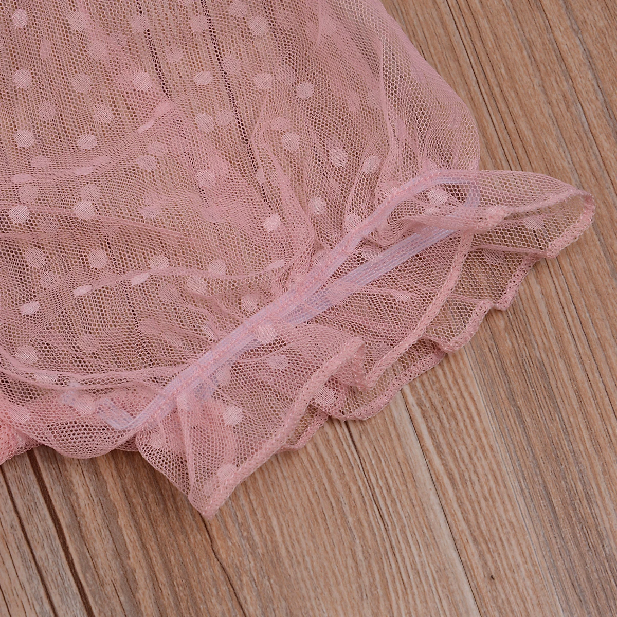 No stretch, when putting it on be very careful because i heard some of the threads make a strained sound. The elastic isn't too tight. 84cm bust, 66cm waist, 167cm height. The sheer fabric is so lovely and the dots and ruffles show up well. It's a little itchy on the skin but wonderful when you layer it. So cute, I wish there was more colors. The pink is a little dustier than in the stock image. No bad smells, one loose thread.