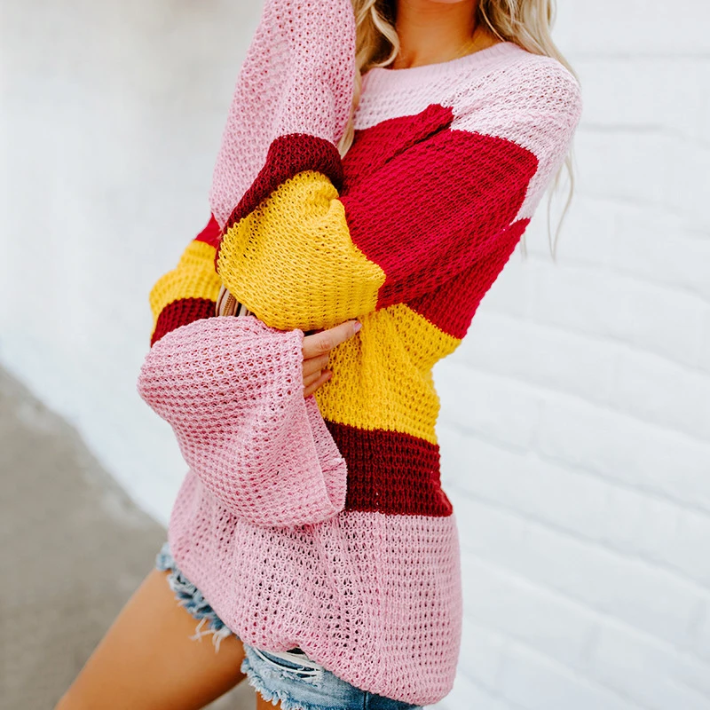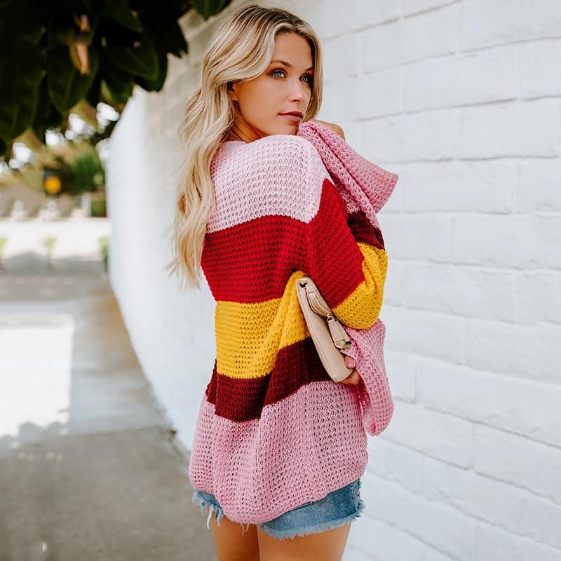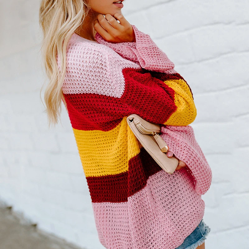 FREE SHIPPING Rainbow Color Loose Bell Sleeve Sweater JKP1347