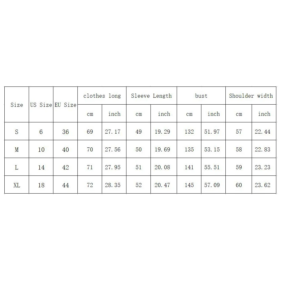 S=US6=EU36(cm/inch),clothes long: 69/27.17,Sleeve Length: 49/19.29,bust: 132/51.97,Shoulder width: 57/22.44