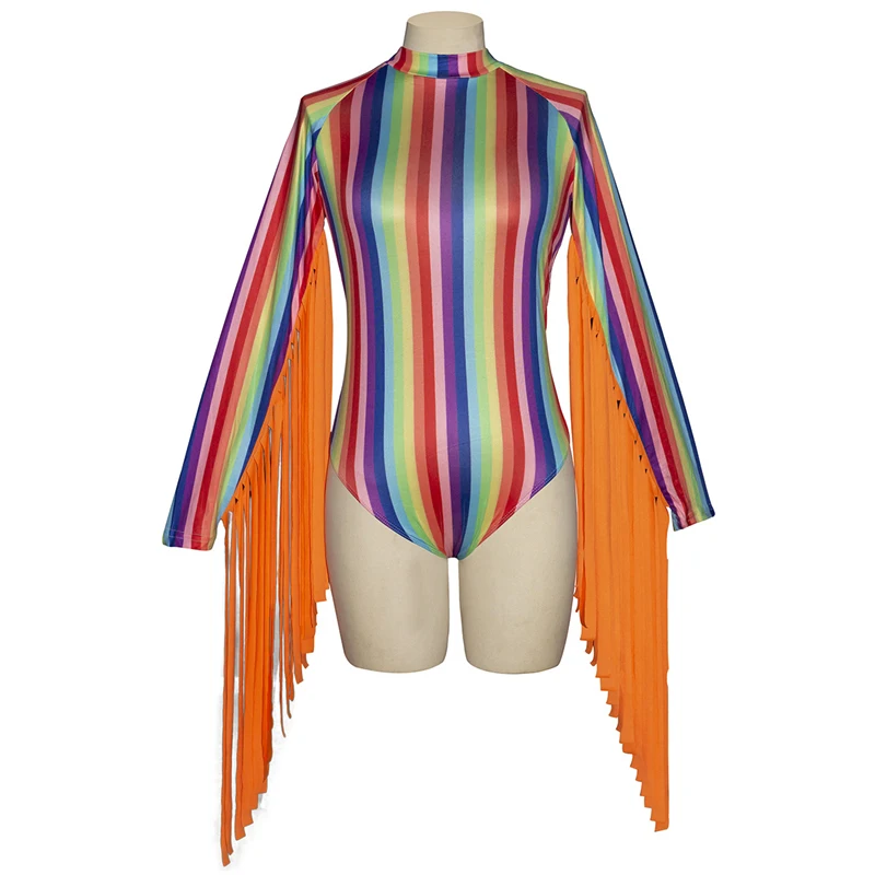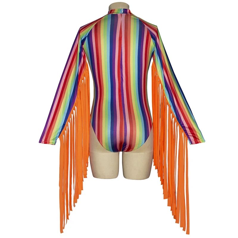 FREE SHIPPING Rainbow Stripes Women O Neck Long Tassels Sleeves Sexy Bodycon Bodysuit JKP3612