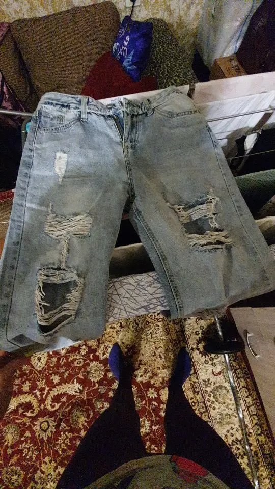 Jeans are made qualitatively of dense fabric, black thread thought marriage, but cut and everything is fine, hips 98, waist 74, chose size xl, high waist is very comfortable to move around, sit, there is a stock in the abdomen for a couple of cm, at the waist a little large, and on the hips sit well, they are shortened, So on my figure pear or triangle look good, the hole for the button had to be cut. really liked jeans, i advise