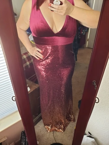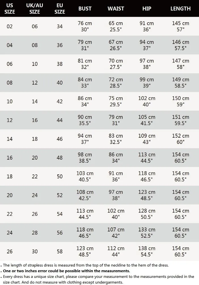 I love this dress! I used the size chart and ordered a us size 16. My measurements in inches are 45-33-44, a size 38 DD chest, and I am between 5'6"-5'7" tall. there was definitely some room in the waist and hips but obviously not too baggy . This dress does not stretch at all. The top is a velvet type material that comes down below your breasts with absolutely no stretch. I'm glad I went with the size 16 because anything smaller would not have fit my upper body. If I want, I can have it tailored to form fit my waist. But I'm pleased with the overall fit right out of the box. This dress is well made. The photo on the website accurately represents the dress I recieved. I can't wait to wear this dress!! My suggestion is to measure yourself accurately and use the size chart.