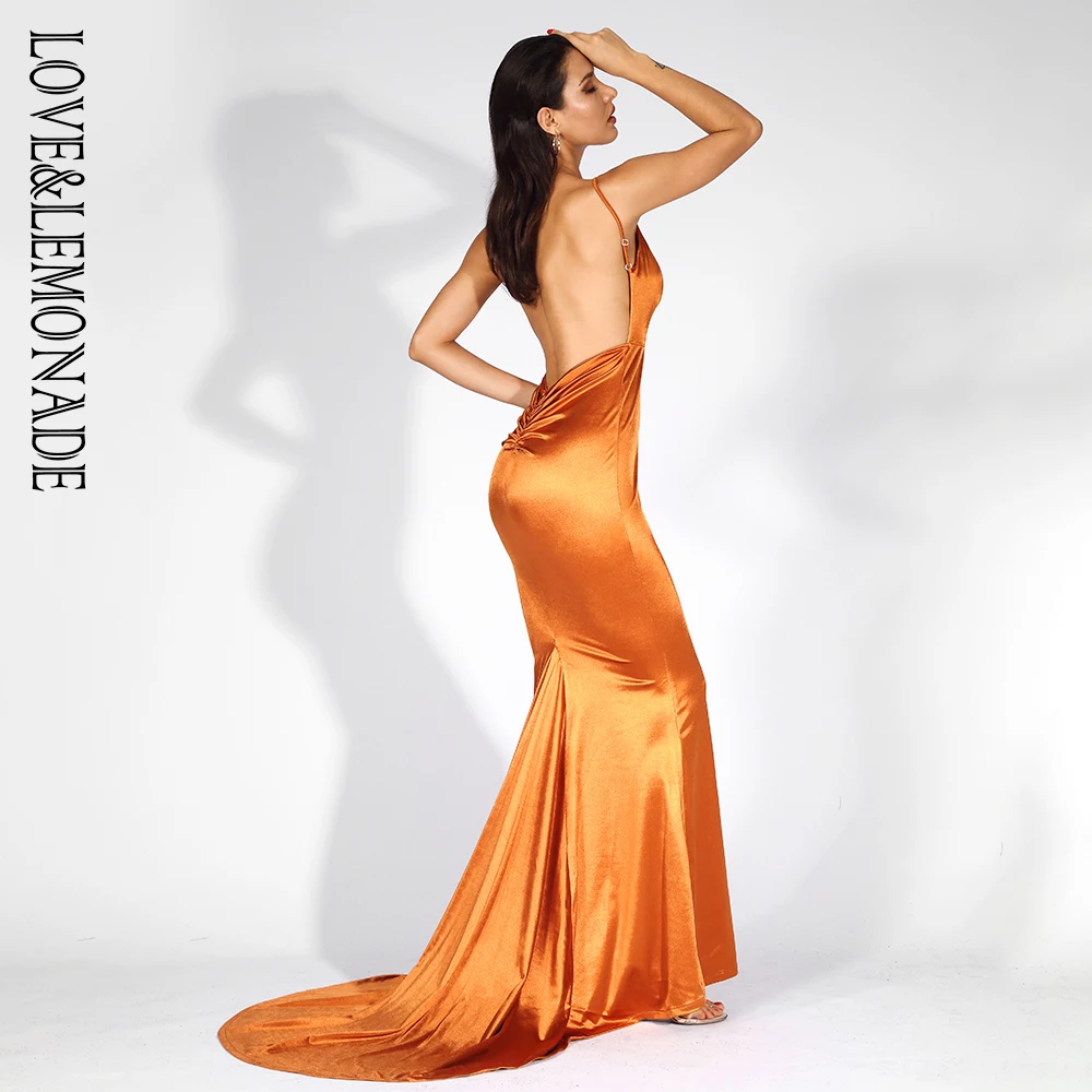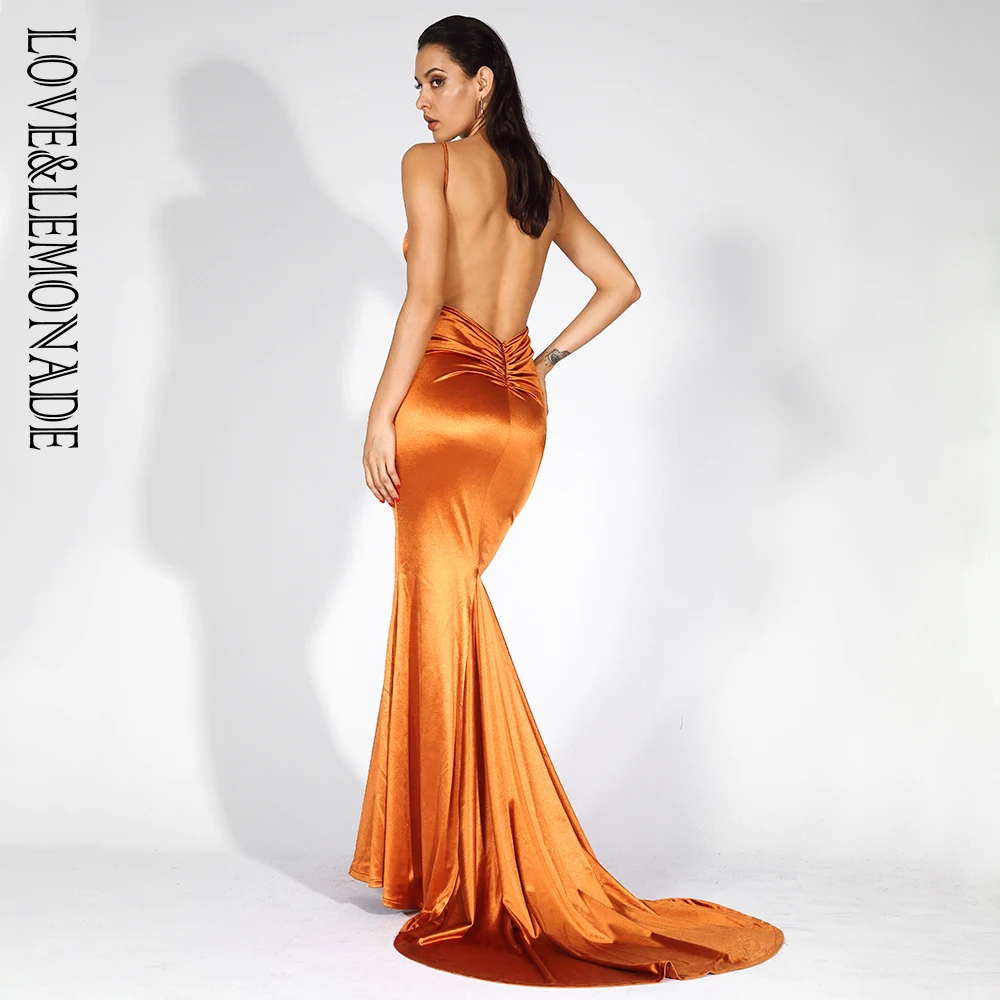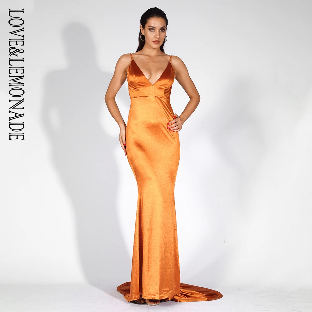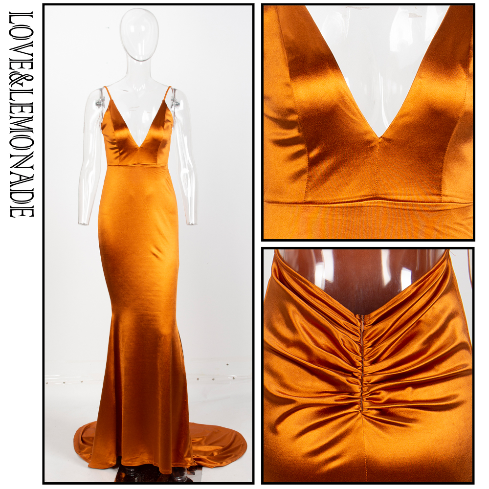FREE SHIPPING Satin Long Dress Orange Deep V-Neck Open Back Slim Fit Party Outfit Dress
