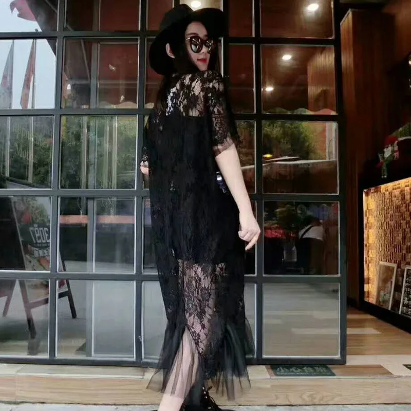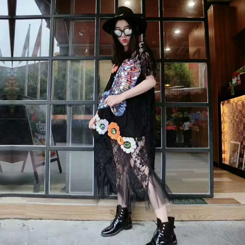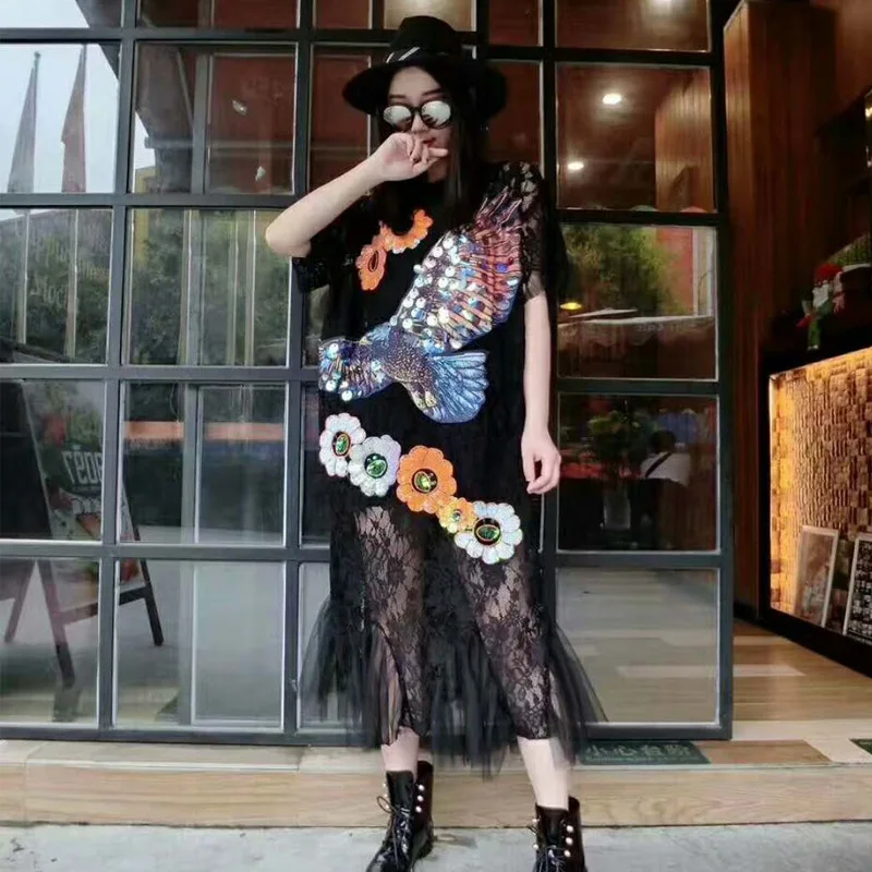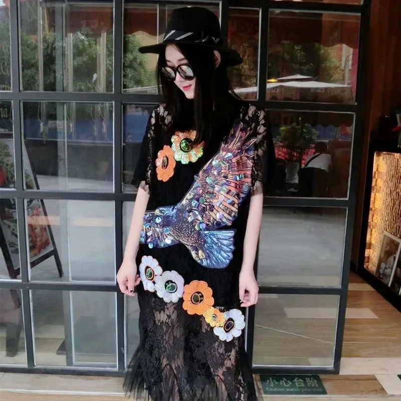FREE SHIPPING Sequin Eagle Dress Women Holes Lace Dress Women Flower Short Sleeve Dress Black Long Patchwork Summer Clothing JKP2093