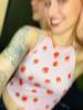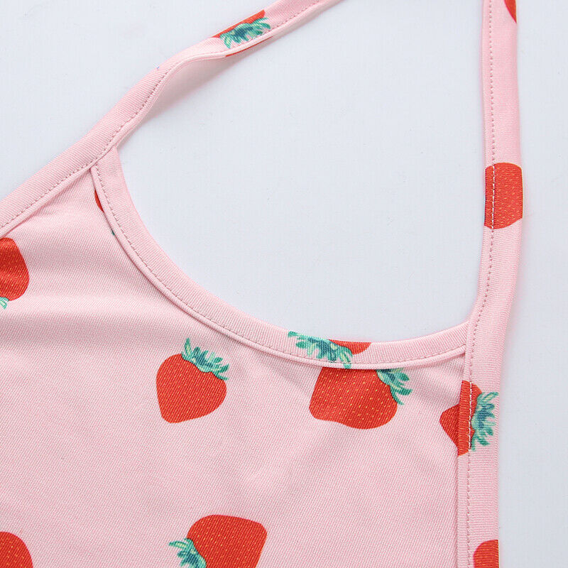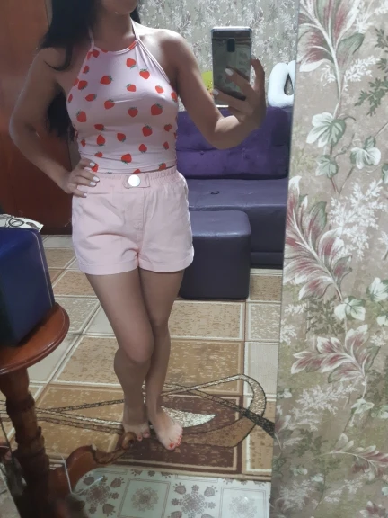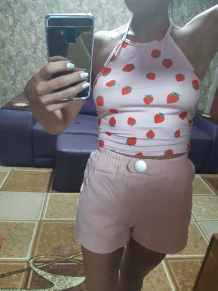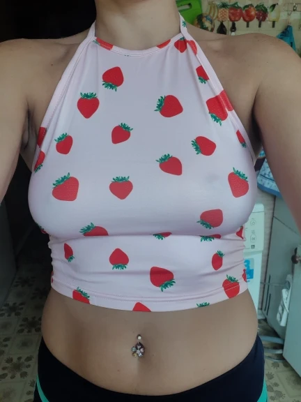 I love this top!! I love all things strawberry & am so excited so have this top!! The material is somewhat silky like spandex but a tad thinner. A flesh tone bra works with it - it is not that sheer but braless you will see your nip marks. The top is a crop top but fitted so it ends right under my belly button which is nice because you can wear it with low rise pants too not only high waisted. It ties at the neck which was comfortable all day & even for sleeping for me. The back is a bit low so nipple pasteys may be the best for not showing any bra at all.