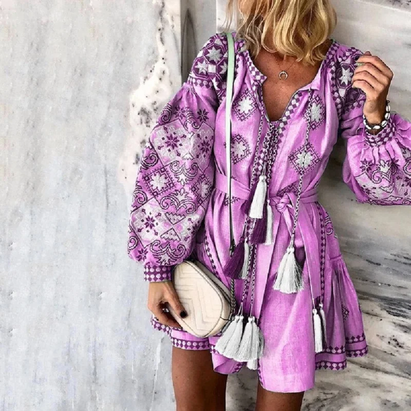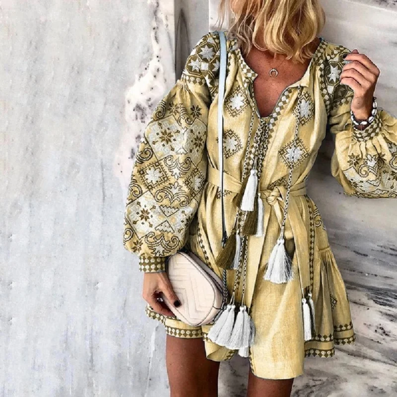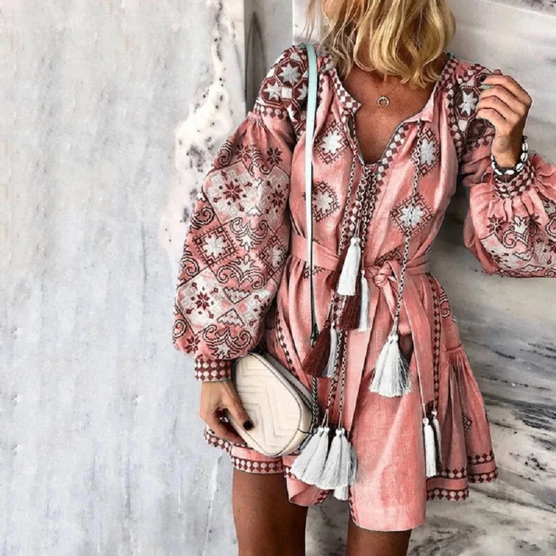FREE SHIPPING Sexy Floral Print Mini Dress Women Autumn Vintage V-neck Lantern Sleeve Dress Casual Lace-up Tassel Plus Size Dress JKP2969