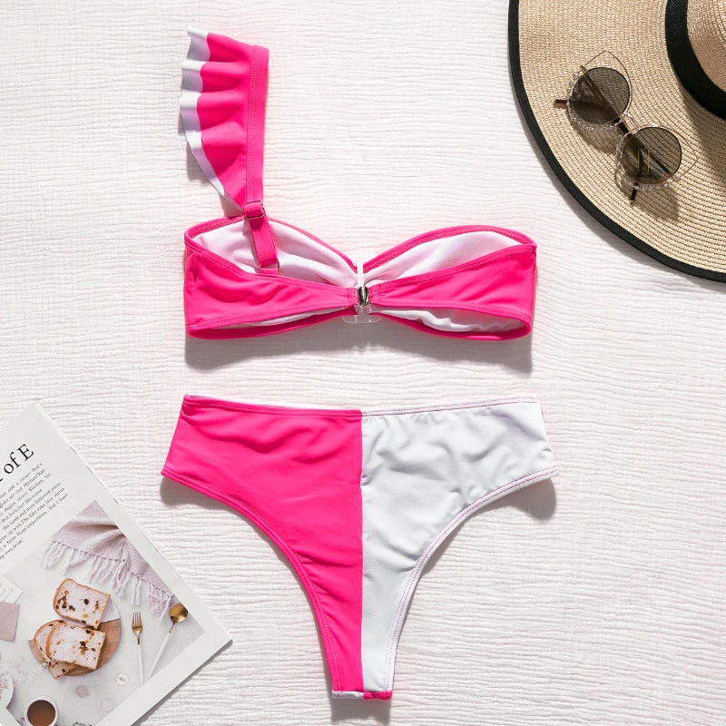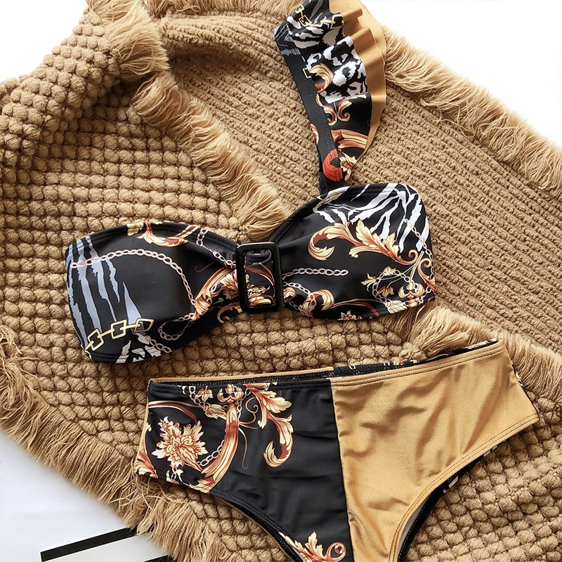 FREE SHIPPING Sexy high waist bikini 2020 One shoulder swimsuit female Ruffle bathing suit Retro floral print swimwear women bathers JKP3502