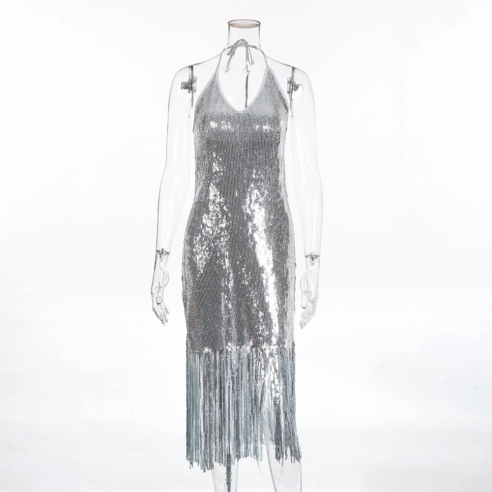 FREE SHIPPING Sexy Long Sequins Summer Tassel Dress JKP1851