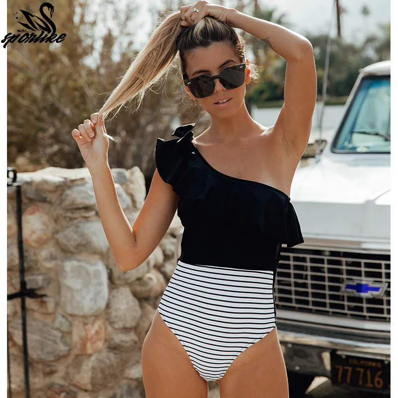 Came with a hygienic sticker. One shoulder swimsuit. Lace inserts on the sides. Black and white. In this case, the strips are correctly sewn, go into the joint. Quality is good. I did not notice any special jambs. Inside, simple cups without push-up. I have the size s. suitable for a full 42. And on the growth to 170 cm. On my 40 below is frayed.