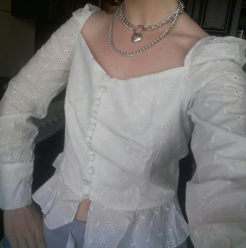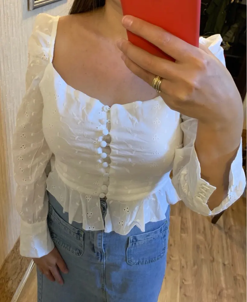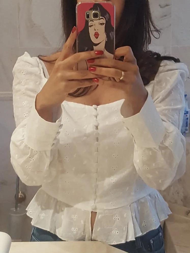 Blouse as in the photo, at 95-70-95 size l sat back to back, but i just wanted it. The only thing i'm worried about is the rubber loops, without a spare pin on the street in it i will not go out :) in general, the purchase is satisfied, thanks to the store!