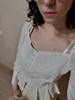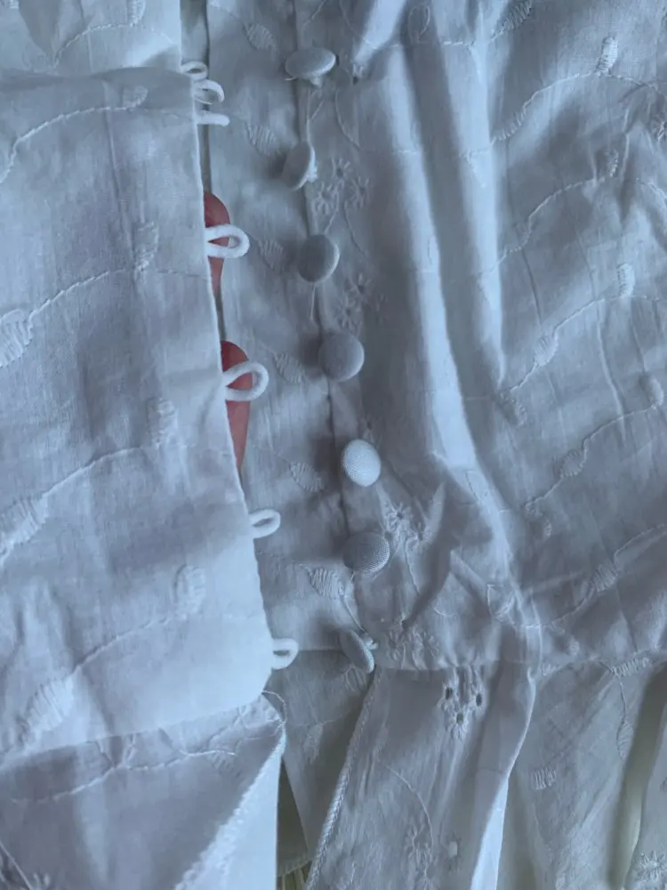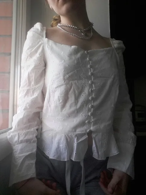 Of good, white, rather thin cotton. Stitched is not very neat, threads stick out of buttons and embroidery in places. Loops for buttons are rubber, fastened very hard, at least for the first time accurately. On the og 85 from 72 on the bodice of the fabric sits a little loose, the sleeves from my shoulders fall off, but they are quite narrow