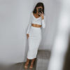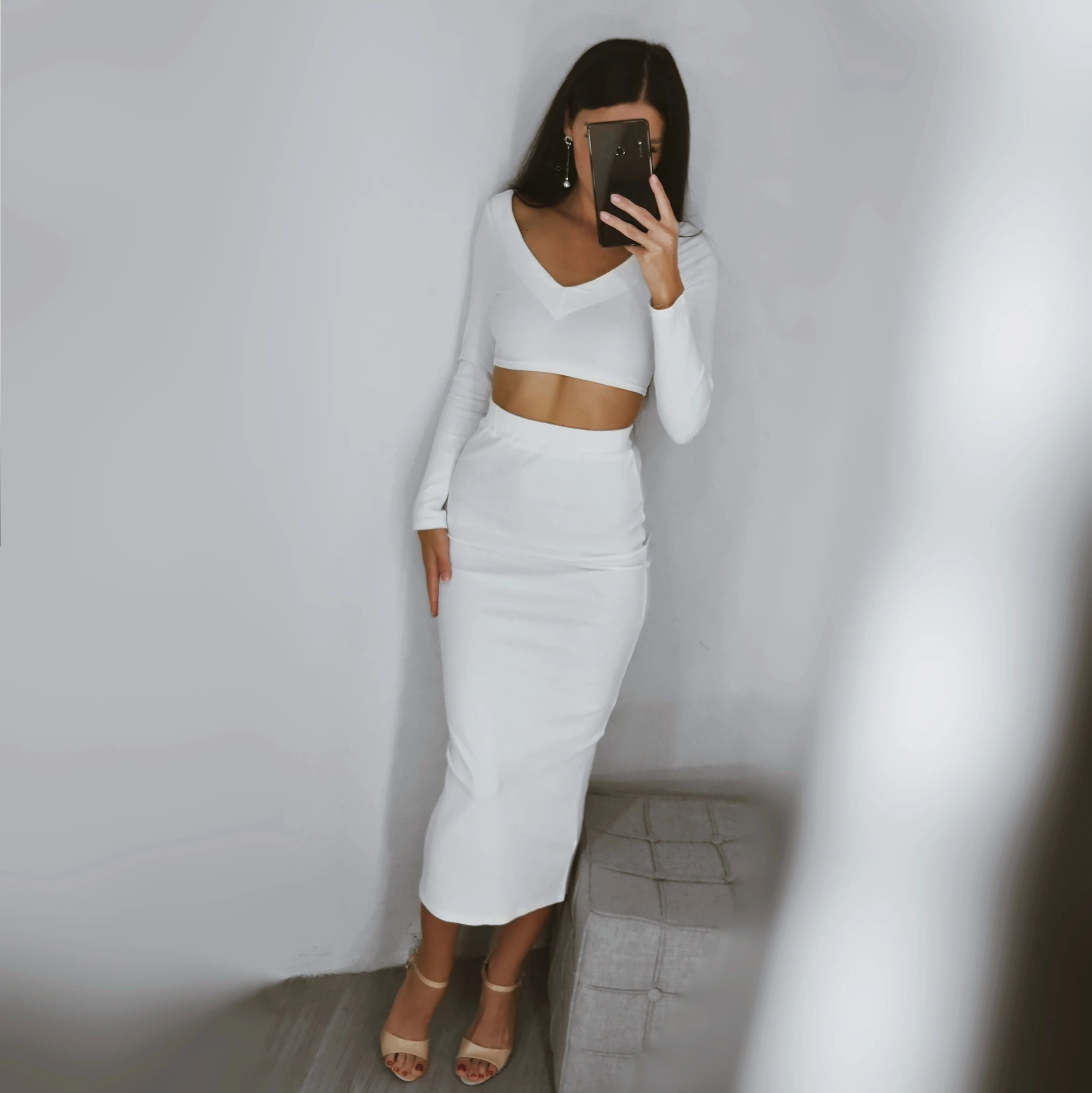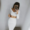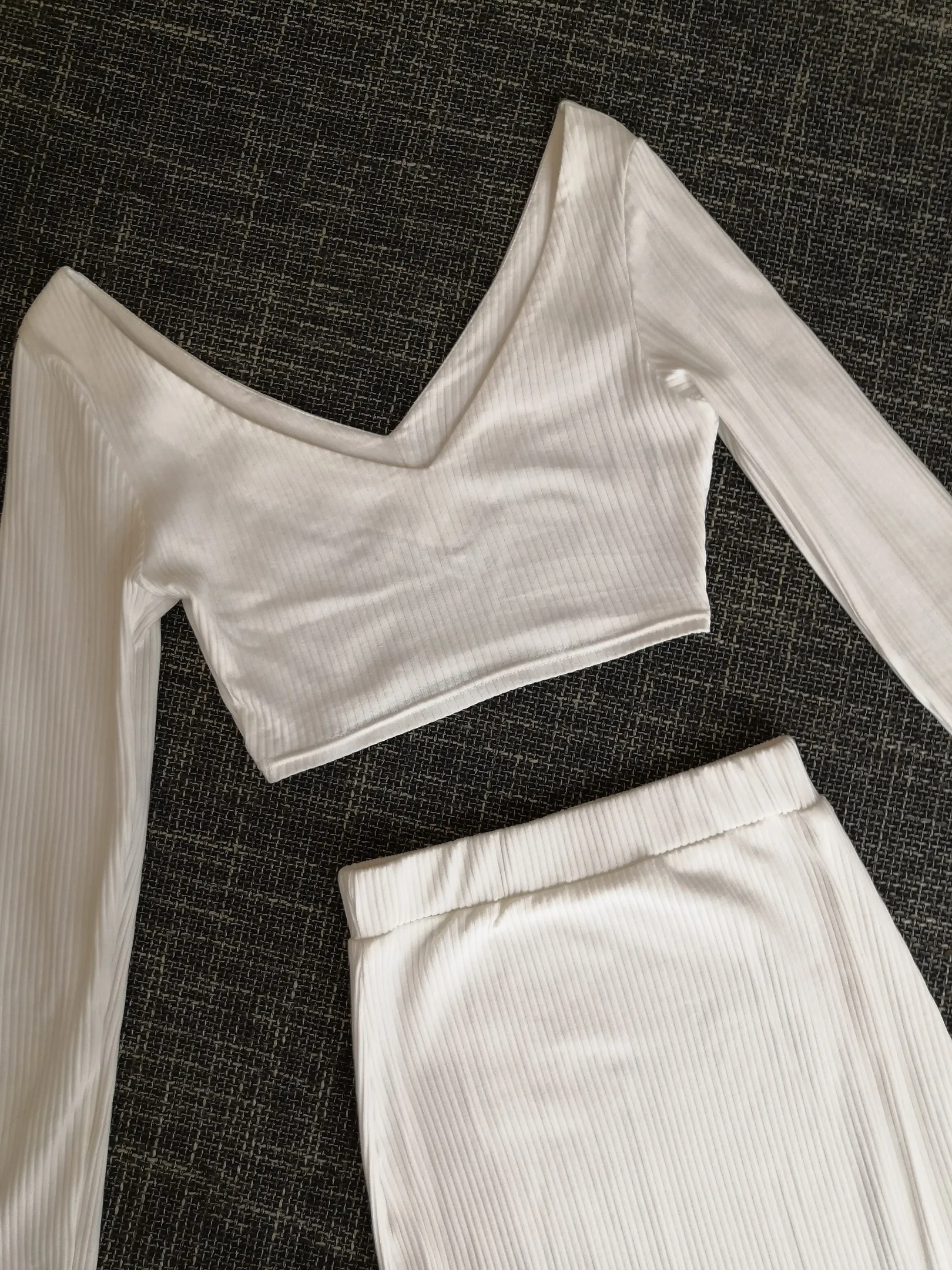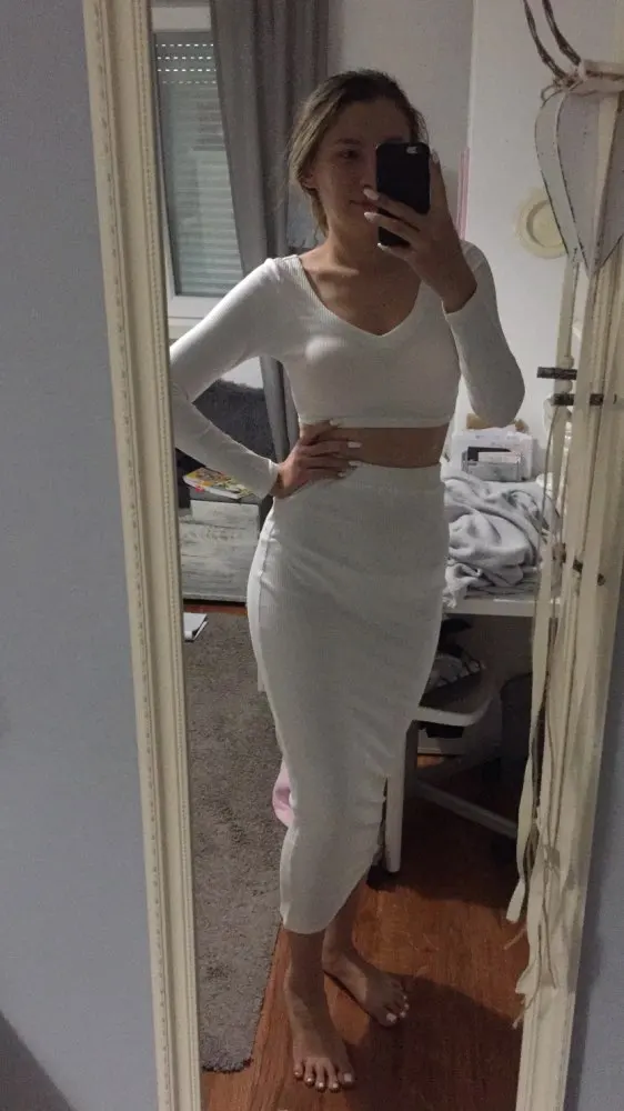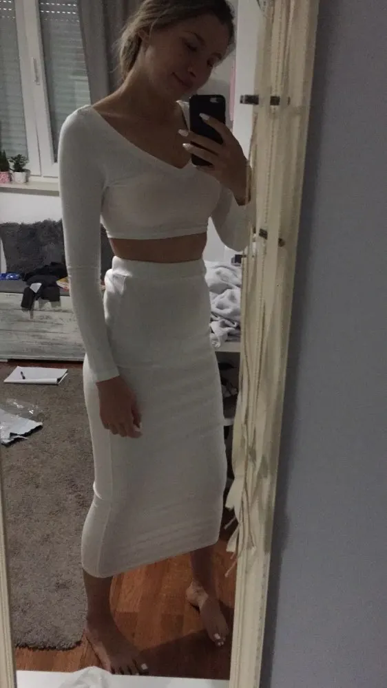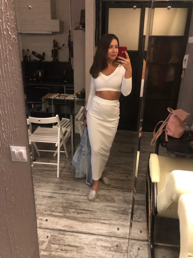 Delightful kit! Sewn neatly, the figure stretches, takes the shape of the body. The fabric is dense, shines slightly, but the underwear is only flesh-colored and seamless. On parameters 88-62-96 and height 170 cm size m sat perfectly. Sleeves are not short. Measurements are very conditional, since the fabric is elastic: shoulders 35, the volume of the chest 72 (stretches to 90 and more), sleeves 58, the length of the top 33, belt on elastic 56 (stretches up to 80 and more), volume on the hips 60 (stretches up to 100 and more), skirt length 92. About my purchases i tell in telegram @ znakomkastore