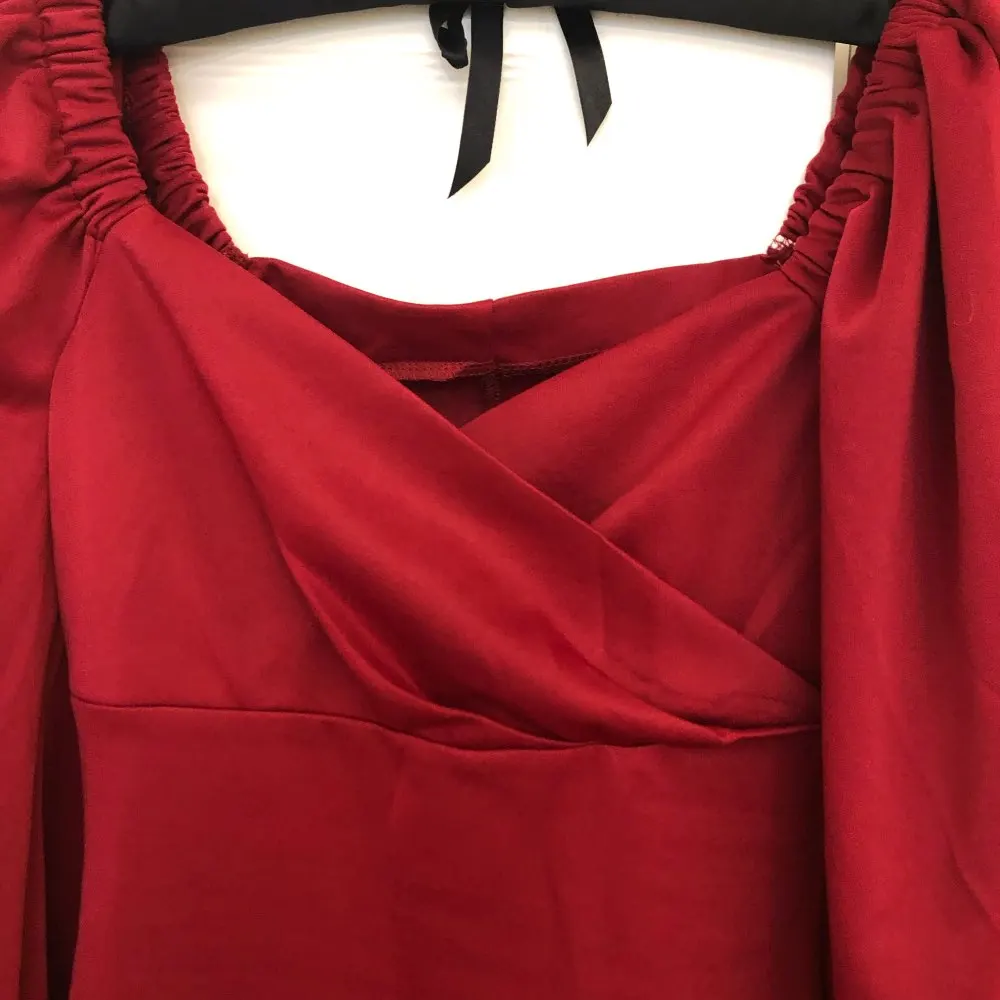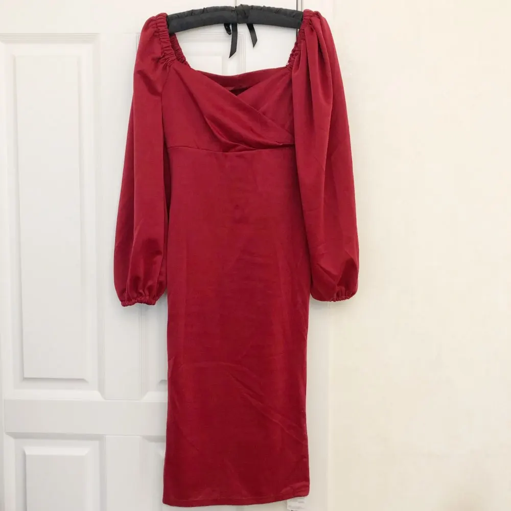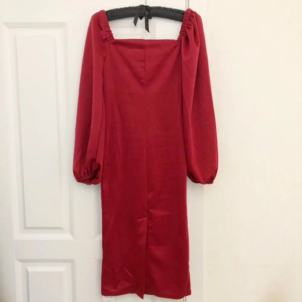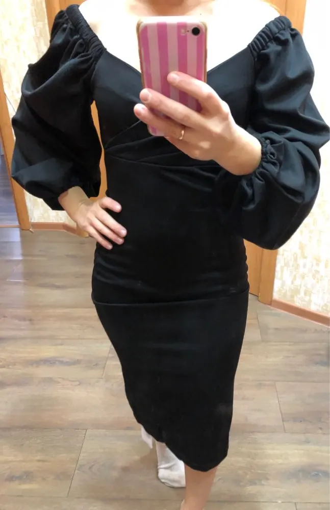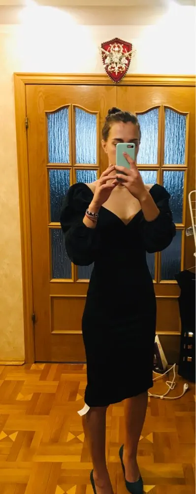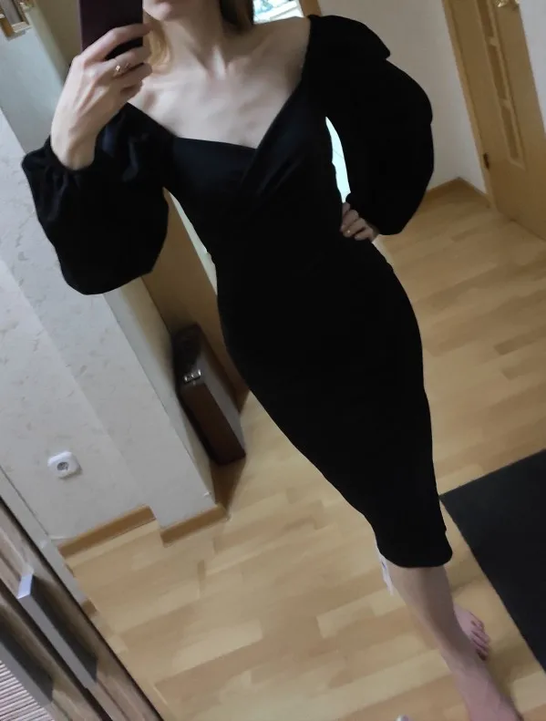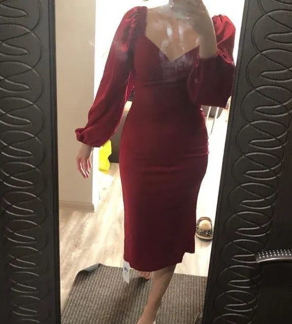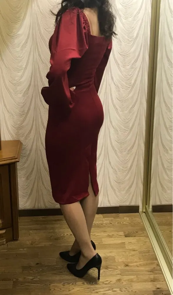 Evening dress, fitted silhouette, with a flirty neckline on the chest, long sleeves with lanterns that hold on the shoulders thanks to rubber bands, behind the dress is a regular square neckline. At the bottom of the skirt behind the slot. Material: Polyester, spandex, not thin, nice to wear. Sewing perfect, no strings and curves seams. On the dress there was a store tag, on the wrong side there is information about the composition of the fabric and the size. Waited for the parcel 20 days, the track was tracked all the way, the dress was packed in the postal package and zip package. The dress fascinated, thanks to the store.