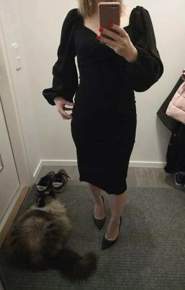 This is actually amazing! So much better than i expected! Perfect dress for Christmas party at work. Looks elegant but sexy. Hugs the figure. I'm short, only 158cm but the length is spot on, goes under knees and high up on my calves. Size M turned out perfect for me, i usually wear size S or 34/36. Fabric is thick and doesn't stretch much. My measures 86, 70, 96 and there's not much room left so if your measure is bigger than that i suggest you to take the next size. There's a little smell, hopefully will erode. Shipping was fast, ordered the 3rd and received the 15th of August.
