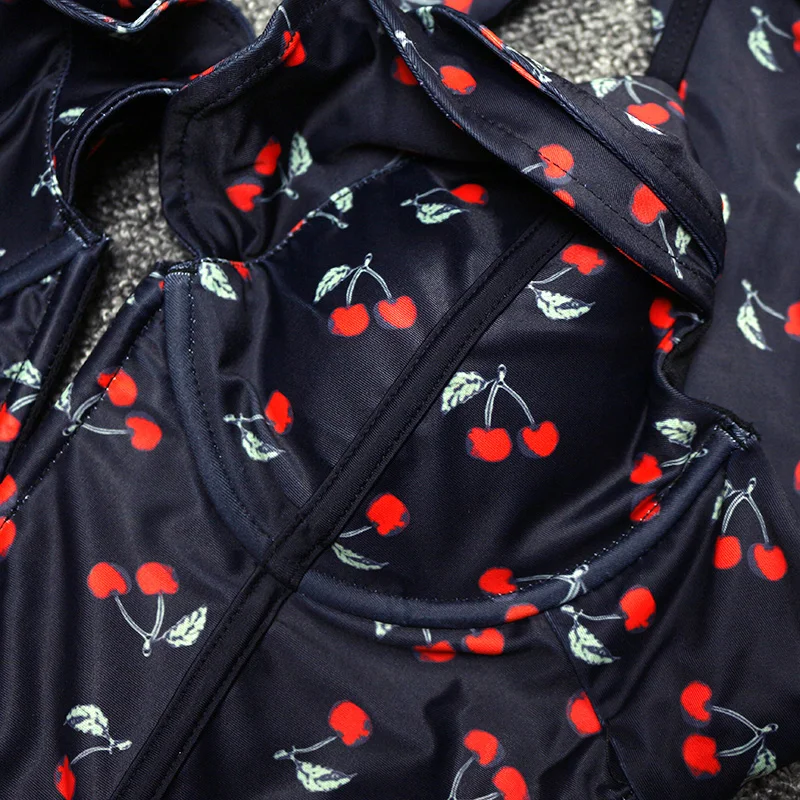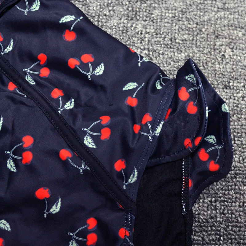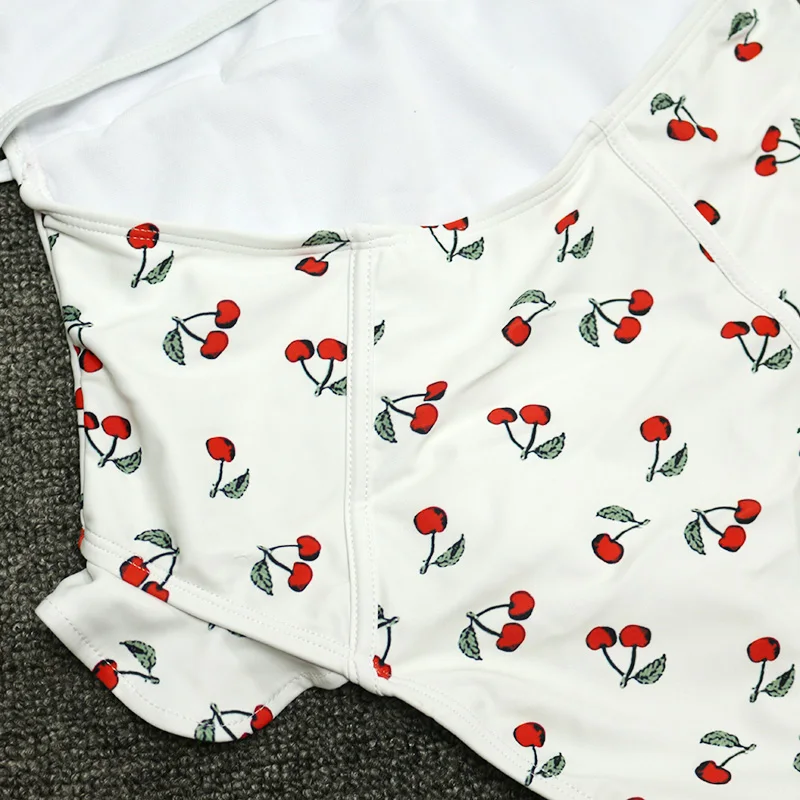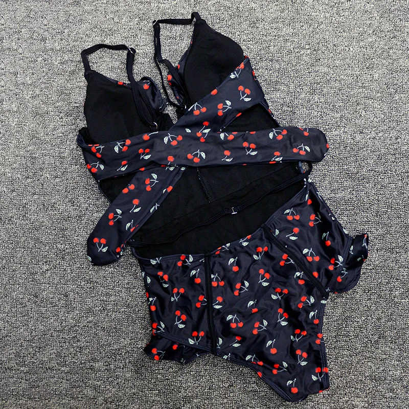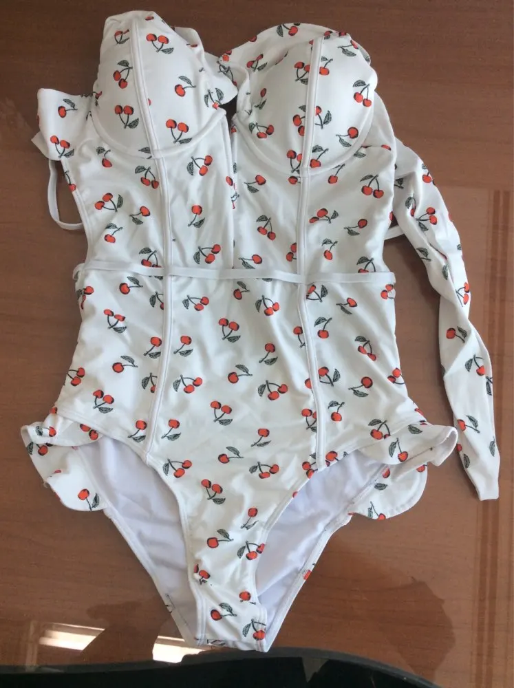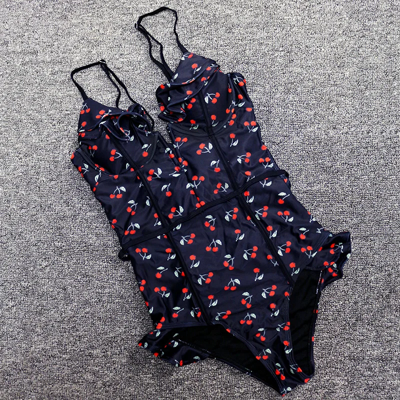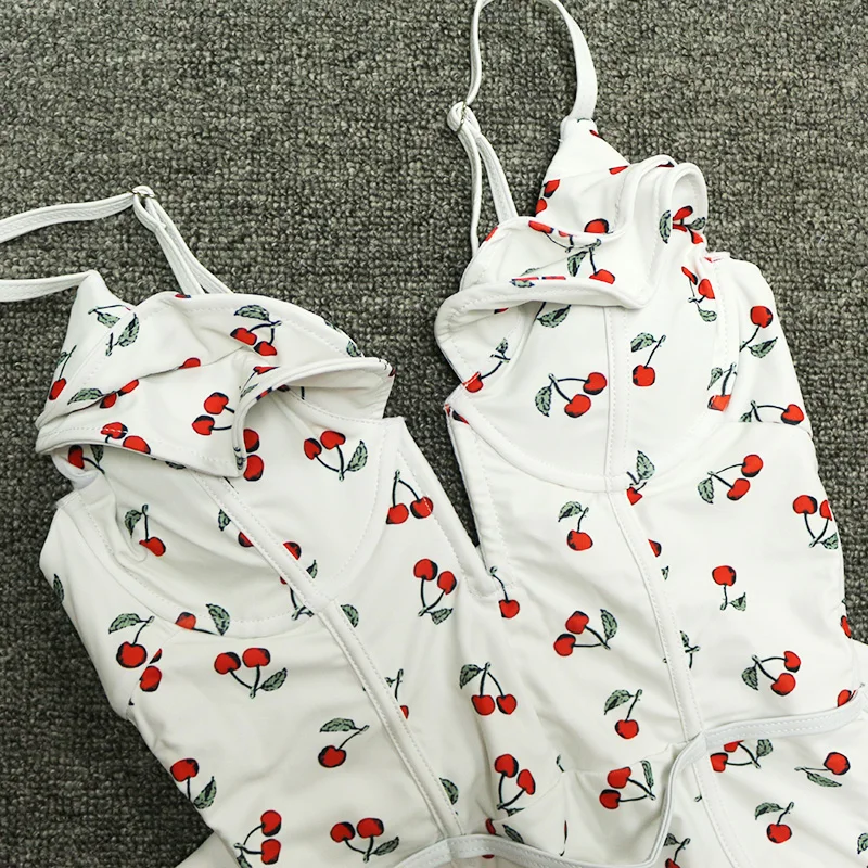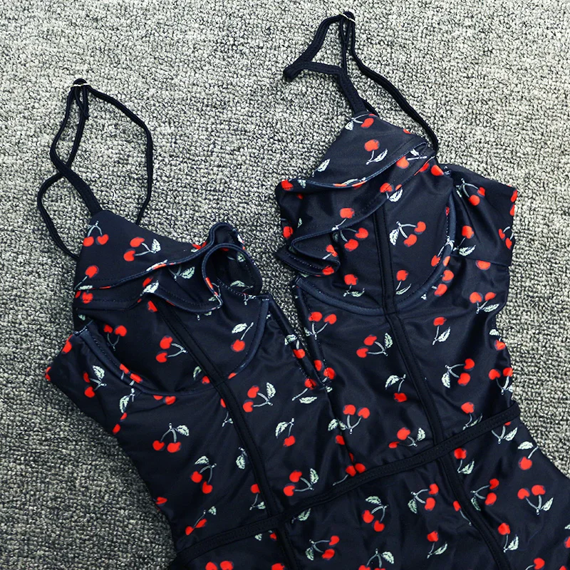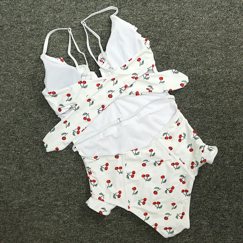 FREE SHIPPING Sexy Vintage White/Black Cherry Floral Deep Plunging V Neck Ruffle Monokini Female Backless Swimwear Women One Piece Swimsuit JKP2403