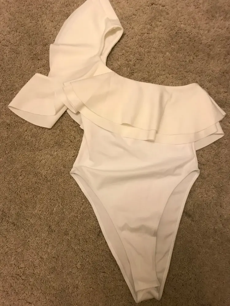 Well, it's identical to that of the image, i just thought it was a little short or tight in the crotch, since it sticks a little and the shoulder with no pull goes a little low, maybe the silicon rib is missing so it doesn't slide down the cleavage but overall it's super pretty