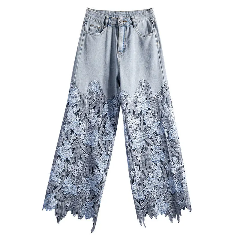 FREE SHIPPING Sexy Women Wide Leg Pants Sheer Mesh Star Print Splice Denim Pants High Waist Casual Loose Pants Jeans Fashion Party Trousers JKP2915