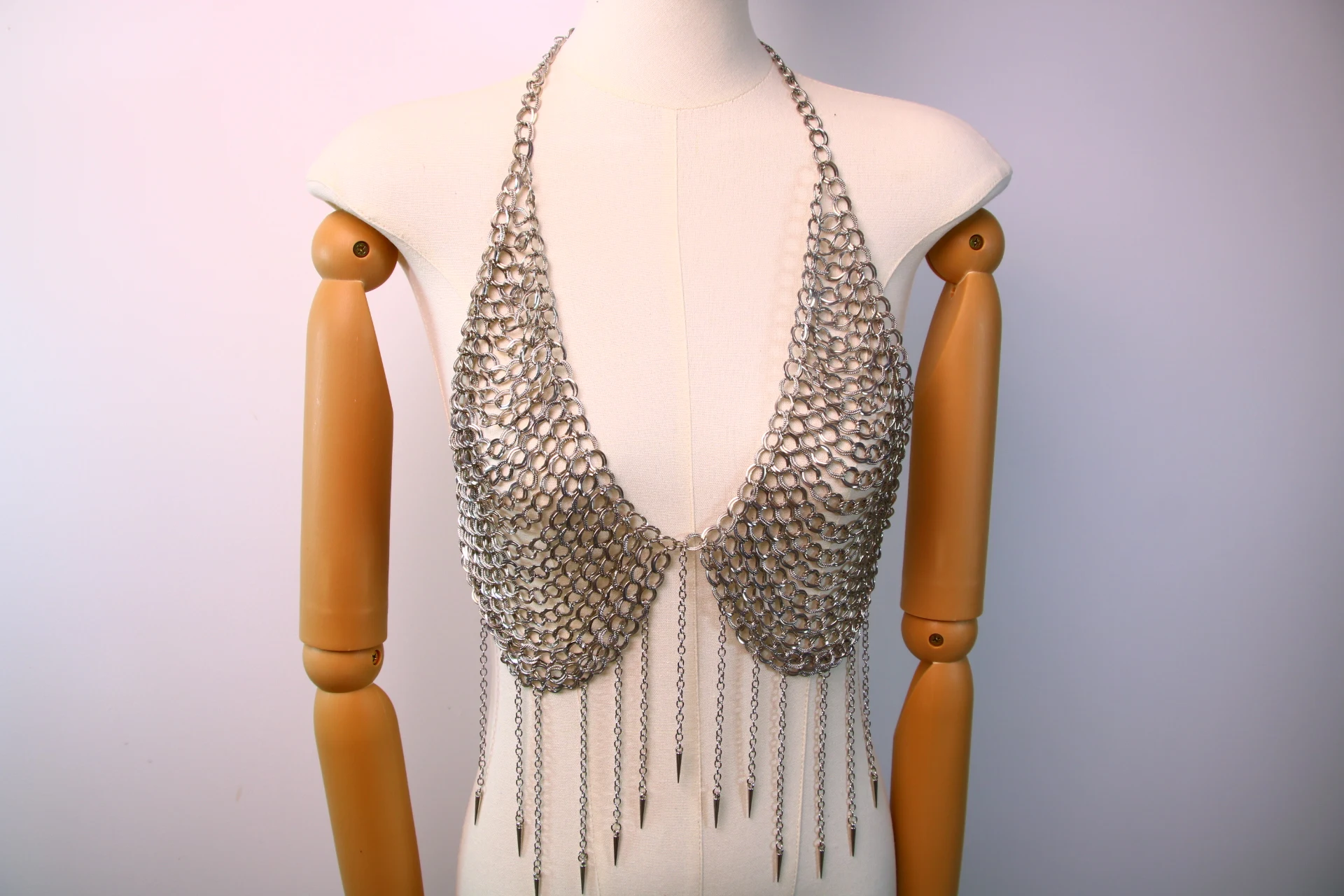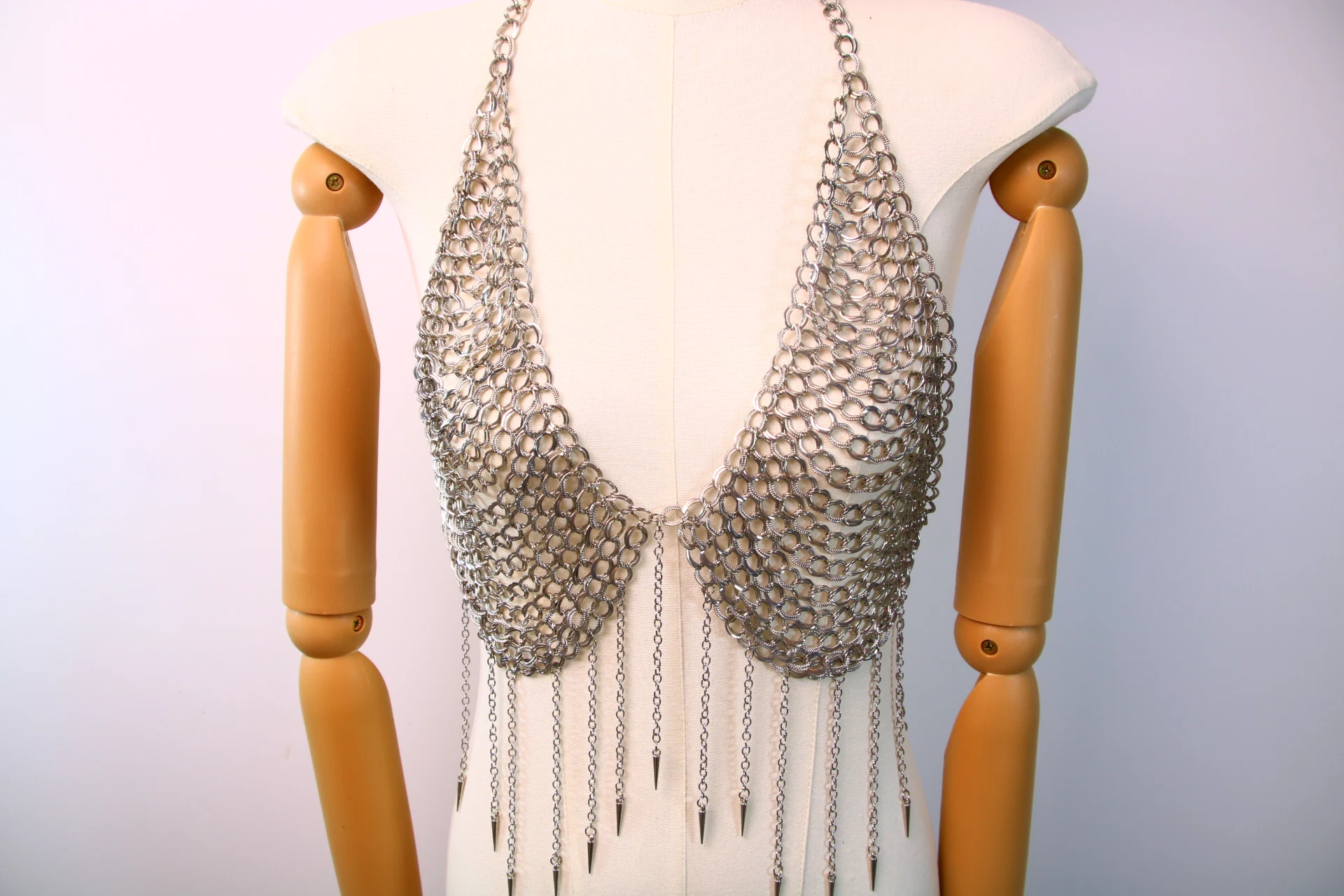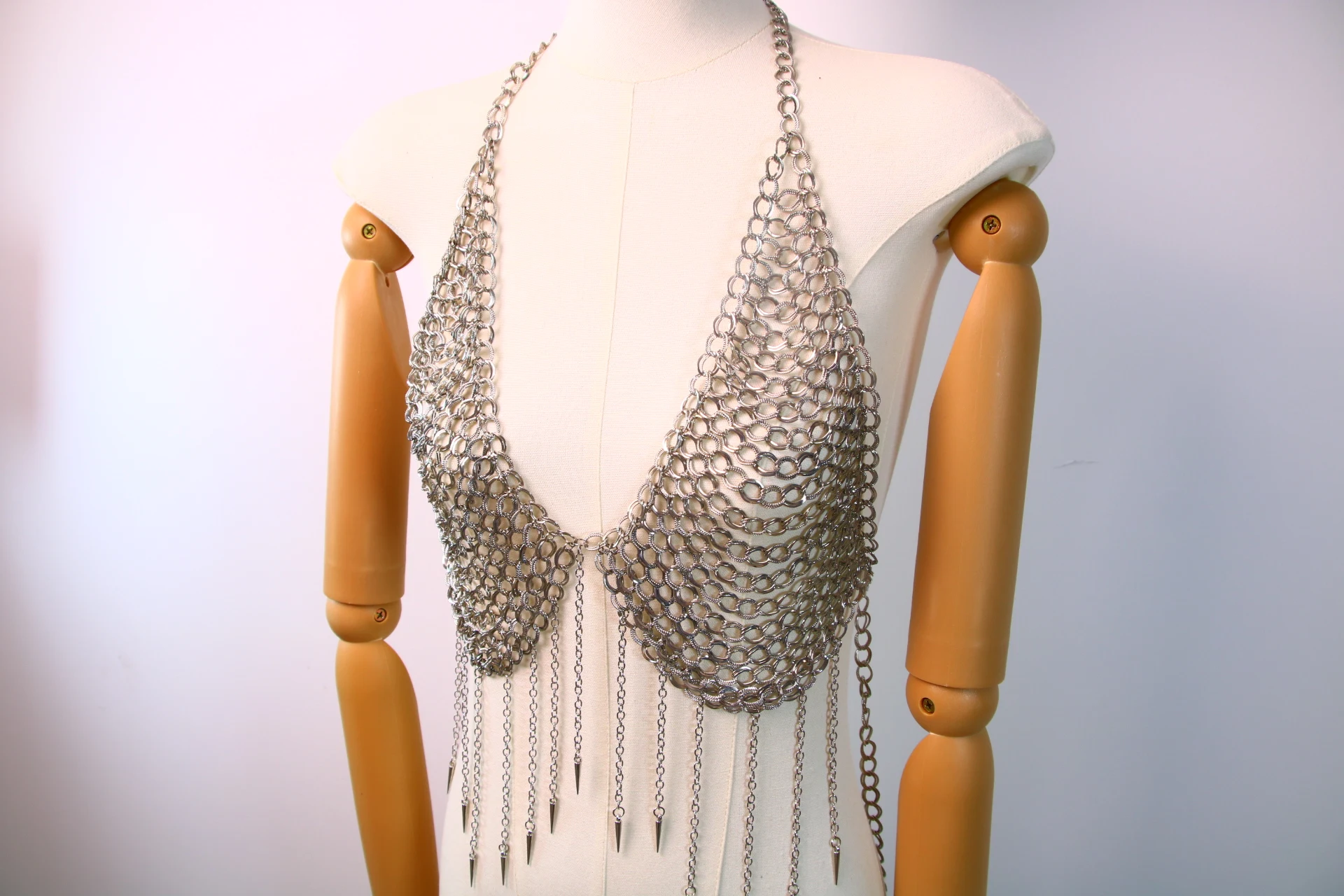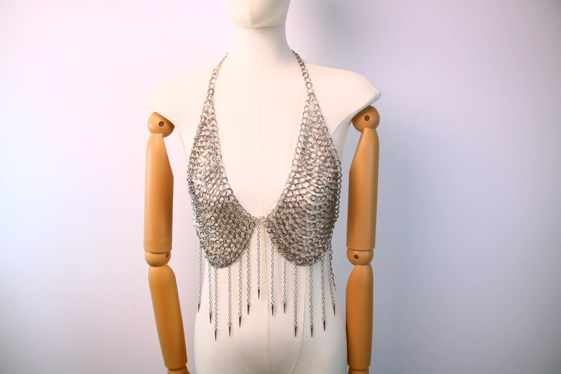 FREE SHIPPING Silver Chainmail Crop Top Festival Metal Bra with Spikes JKP7322